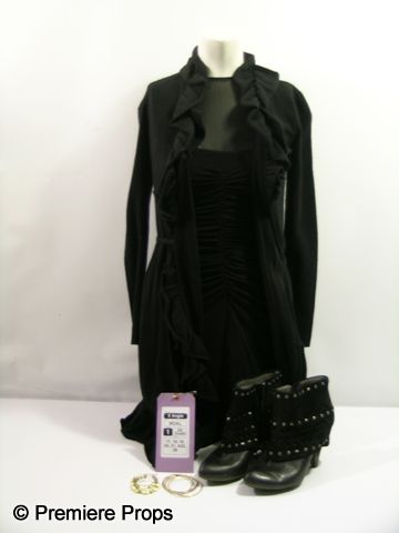 Man on a Ledge (2012) - Angie (Genesis Rodriguez) screen worn, hero, black cashmere knit with ruffled trim, self tie belt, 'Cathrine Malandrino' sweater, long sleeve mesh with scrunched torso 'Laundry' dress, (size 2) fake gold bamboo style earrings, fake gold bracelets, and black leather fold over suede with studs 'Miss Sixty' boots. (size 38M) Includes wardrobe tag!