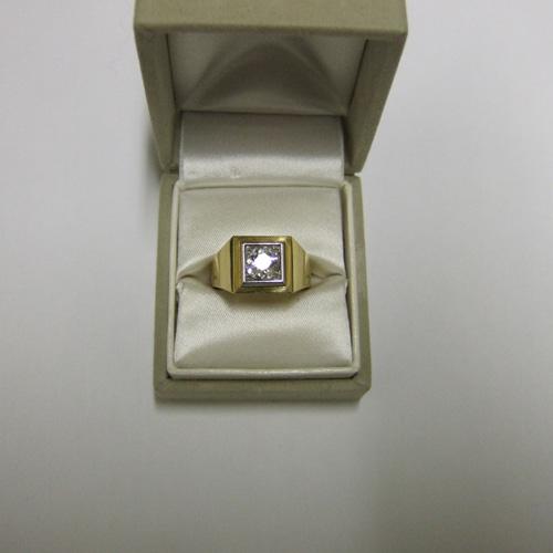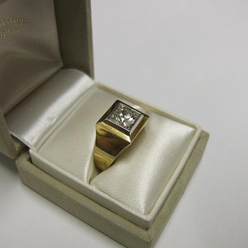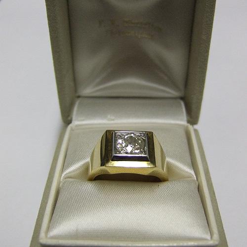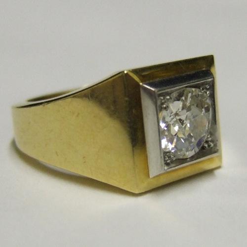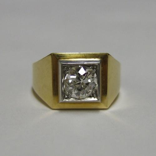Man's 18k 3/4 carat mine cut diamond ring; stone measures approximately 76 points; clarity VS1; color G; stone is set in 18k yellow gold square mounting topped with white gold around bezel; size 5; weight 9.9 dwt/15.4 grams (no visible defects)
