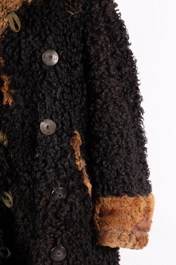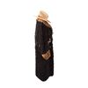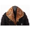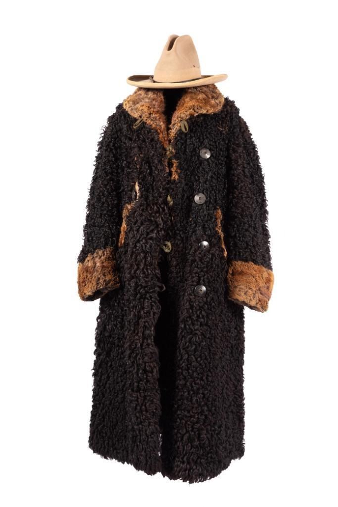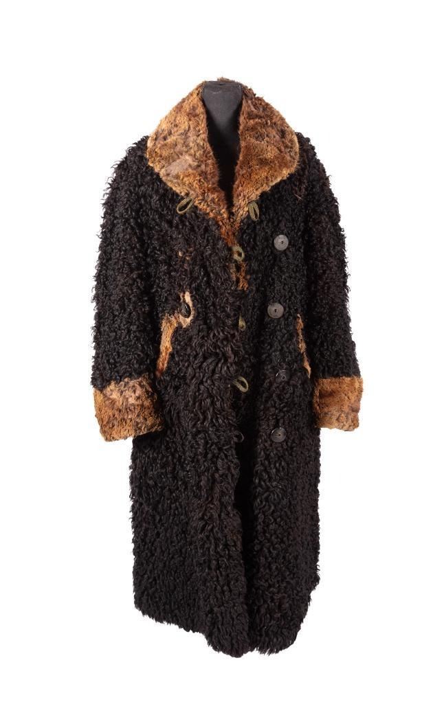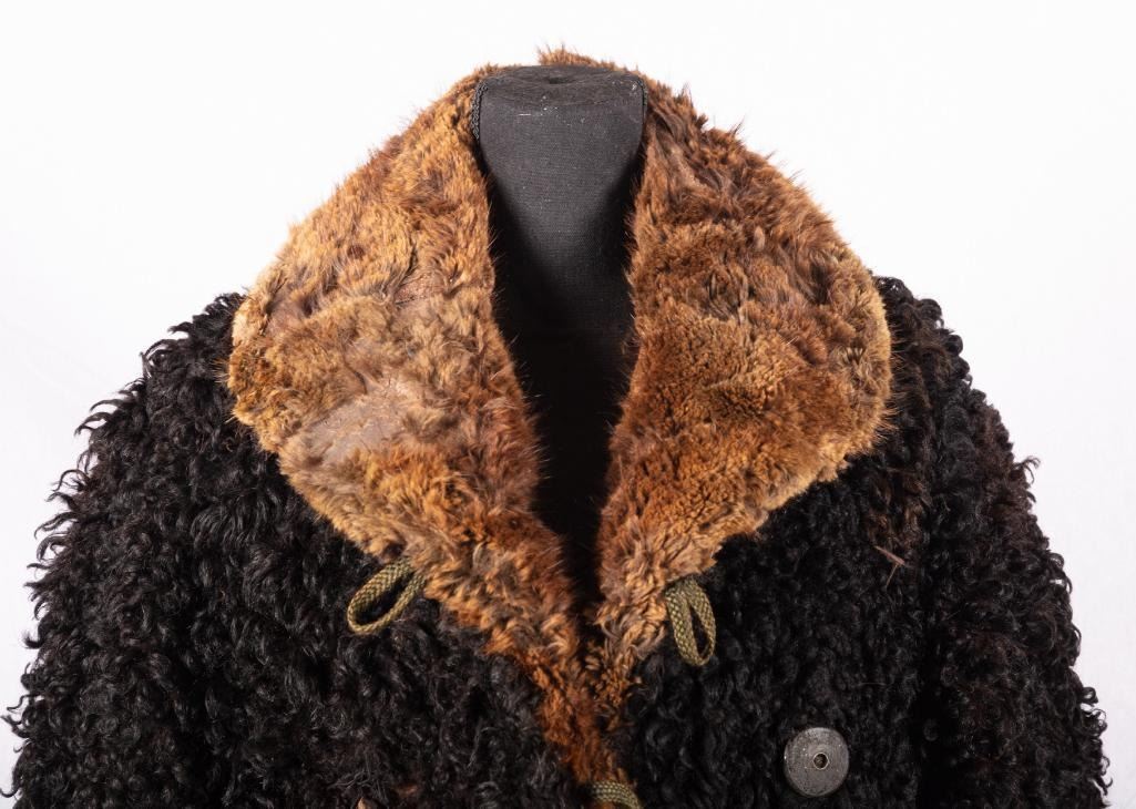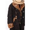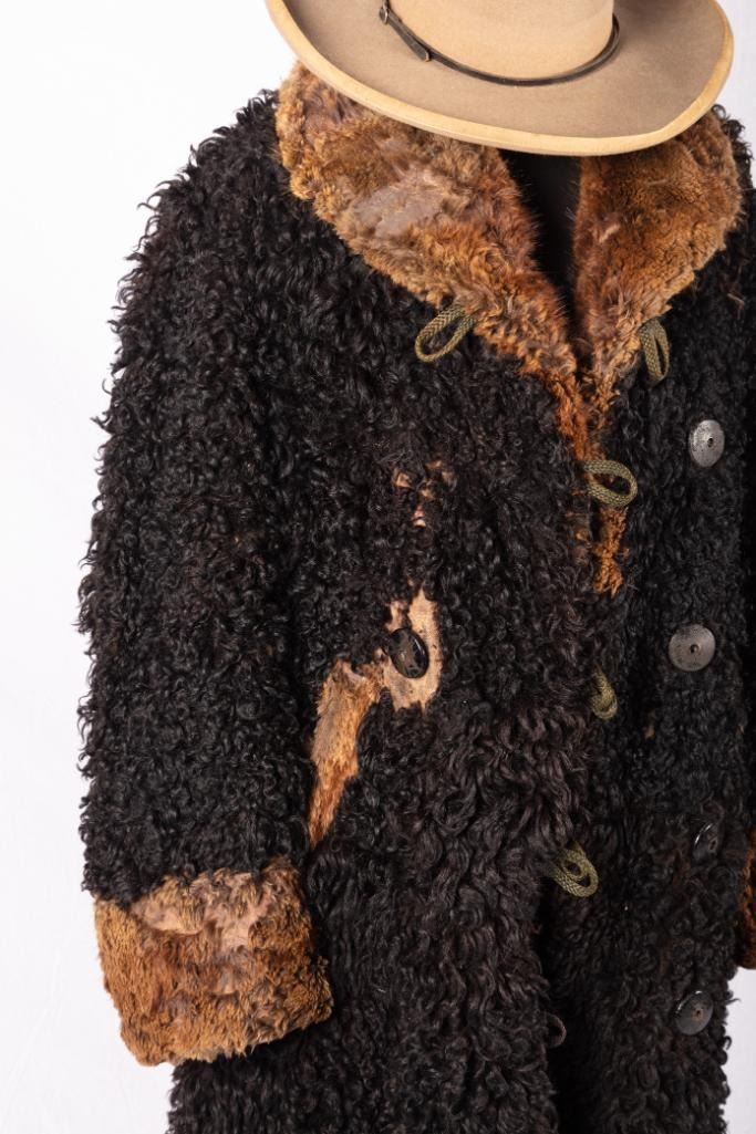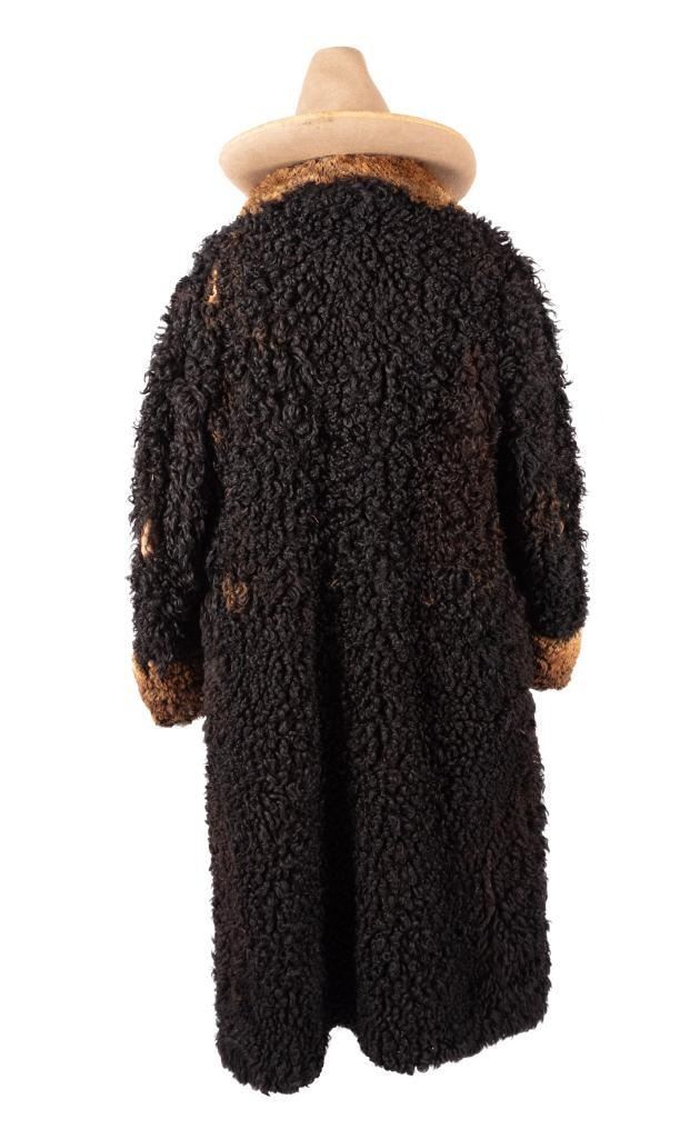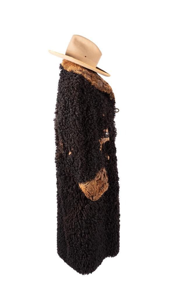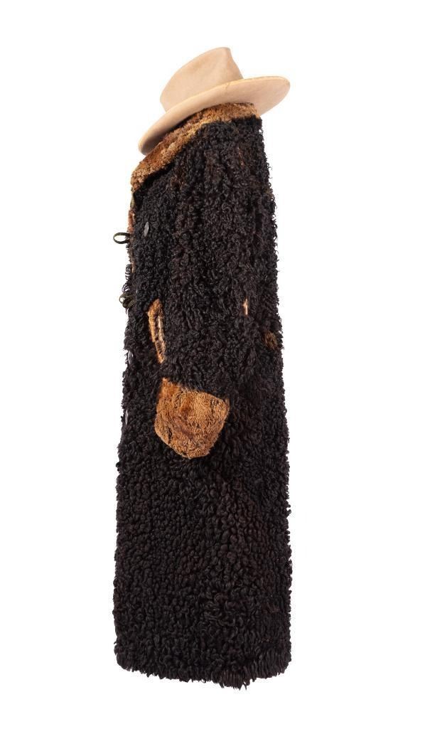 Coat is 54" long x 20" shoulder to shoulder. Black sheep skin, with beaver fur trim. Very showy with custom stand. Marked Carlson Bros., Mankato, Minn. Circa 1880.