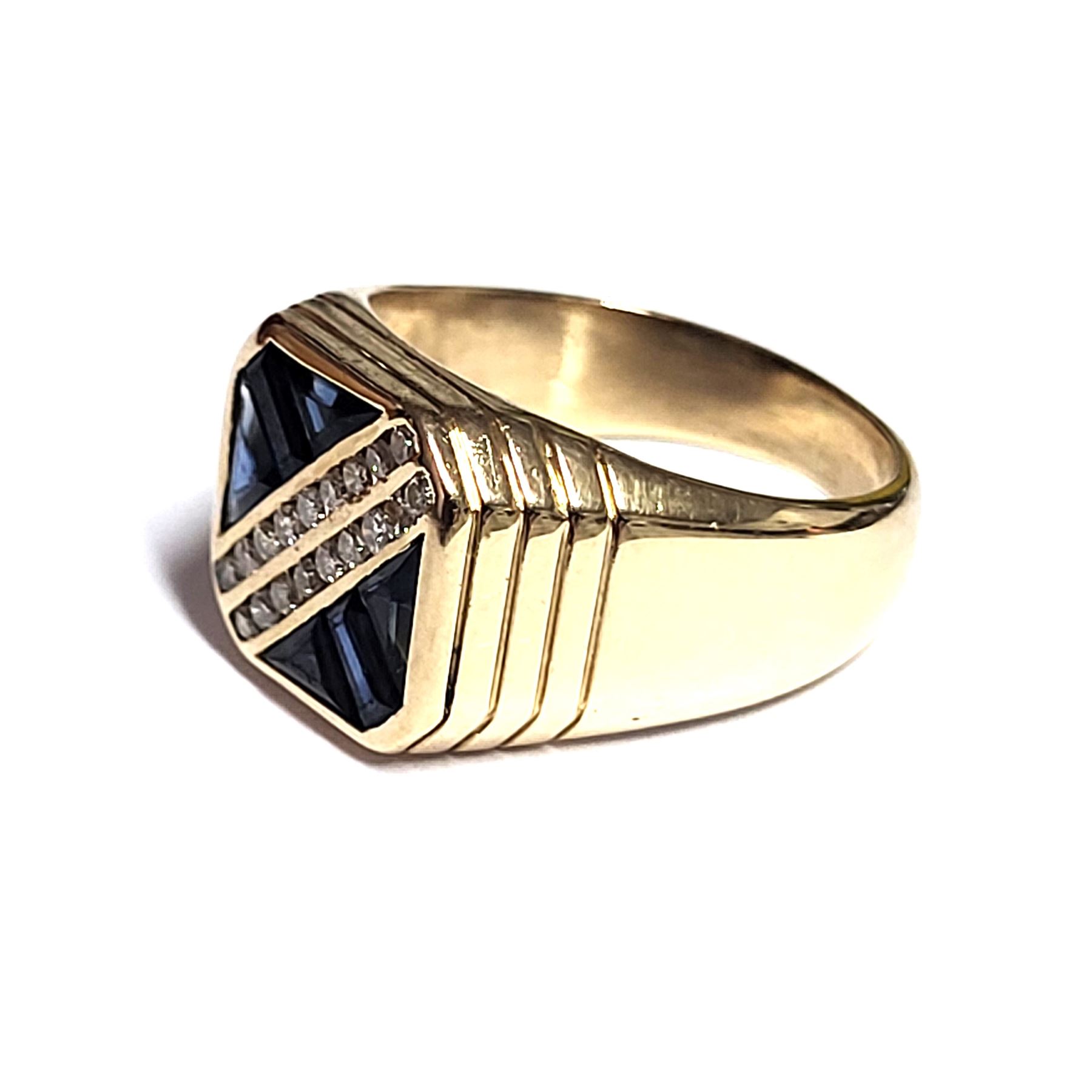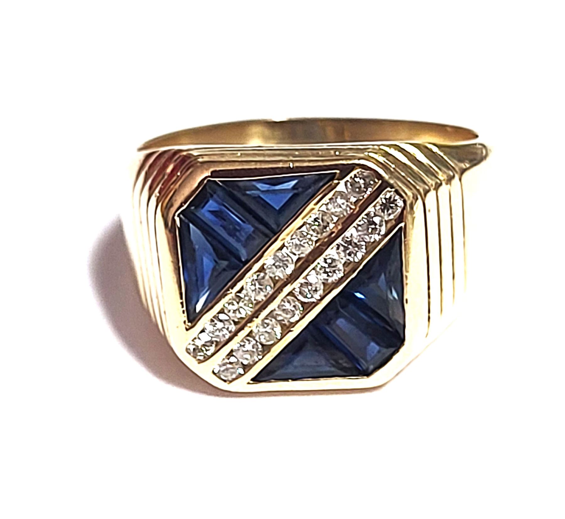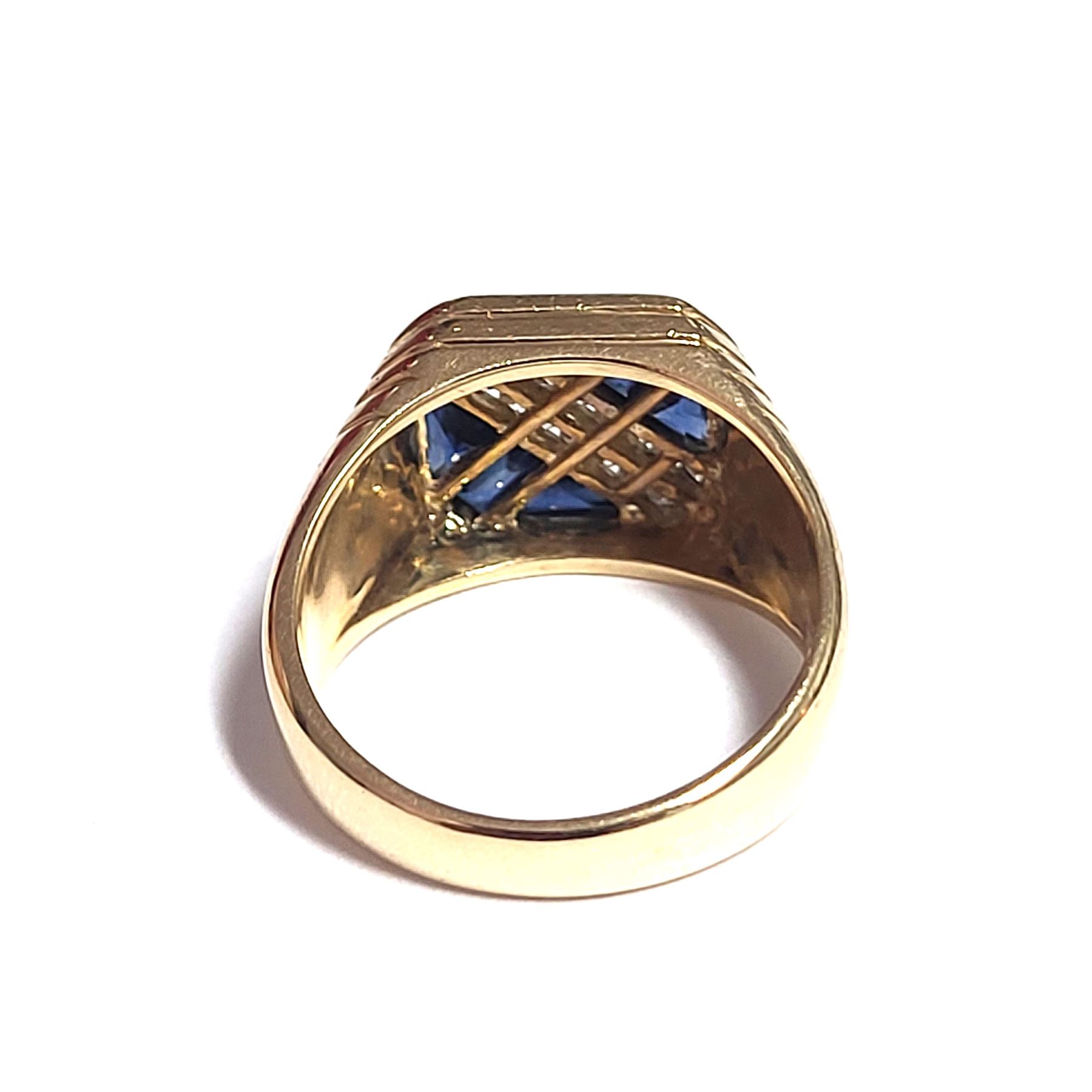 This is a 14 karat yellow gold& nbsp; approximately 1.00 carat total weight of trilliant- and baguette-cut invisible-set genuine blue sapphires and approximately .25 carats total weight round, brilliant-cut, approximate H color, SI2 clarity channel-set diamonds arranged diagonally across the center of the ring.& nbsp; It has a supportive lattice under gallery.& nbsp; The top of the ring is approximately 12mm& nbsp; and the ribbed shoulders taper to an approximate 4mm shank.& nbsp; The ring is US size 8 and can be sized for an additional charge. This item is eligible for appraisal at a discounted rate, from an independent appraiser (with qualifying credentials from GIA) with no affiliation to Bidfair Fine Jewelry. Please contact Bidfair Fine Jewelry for more information on appraisals and sizing. Admin: 33109/25irh