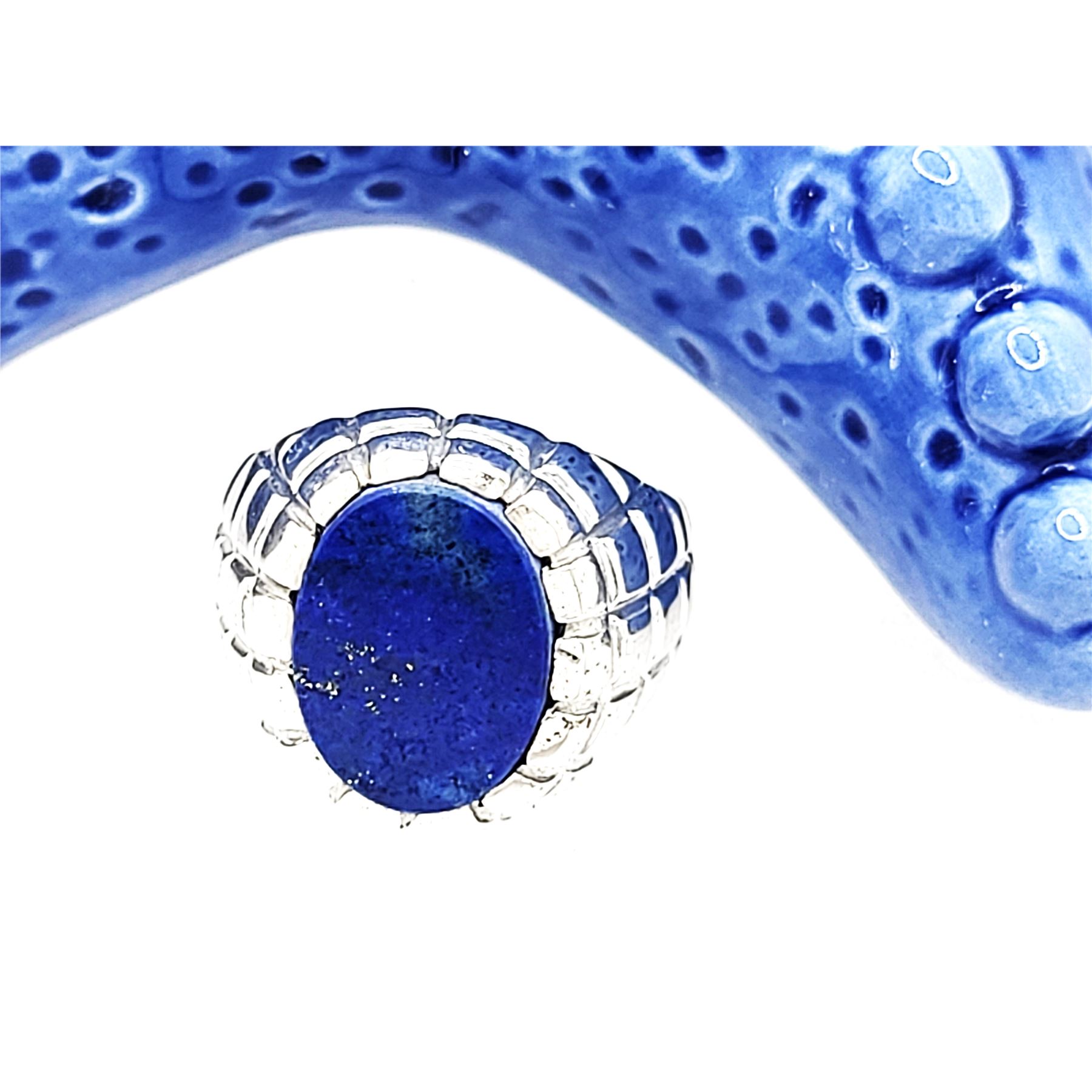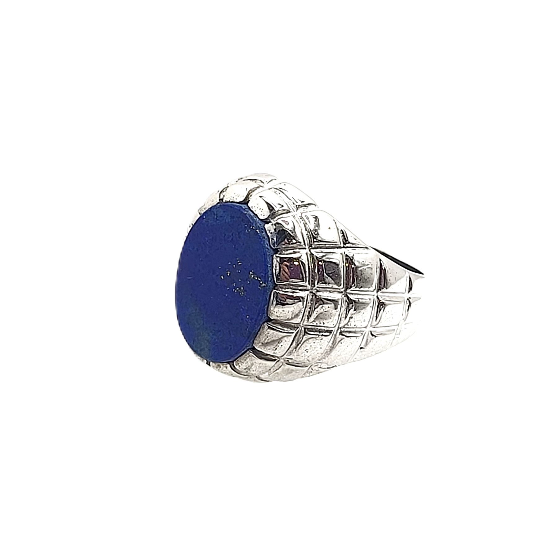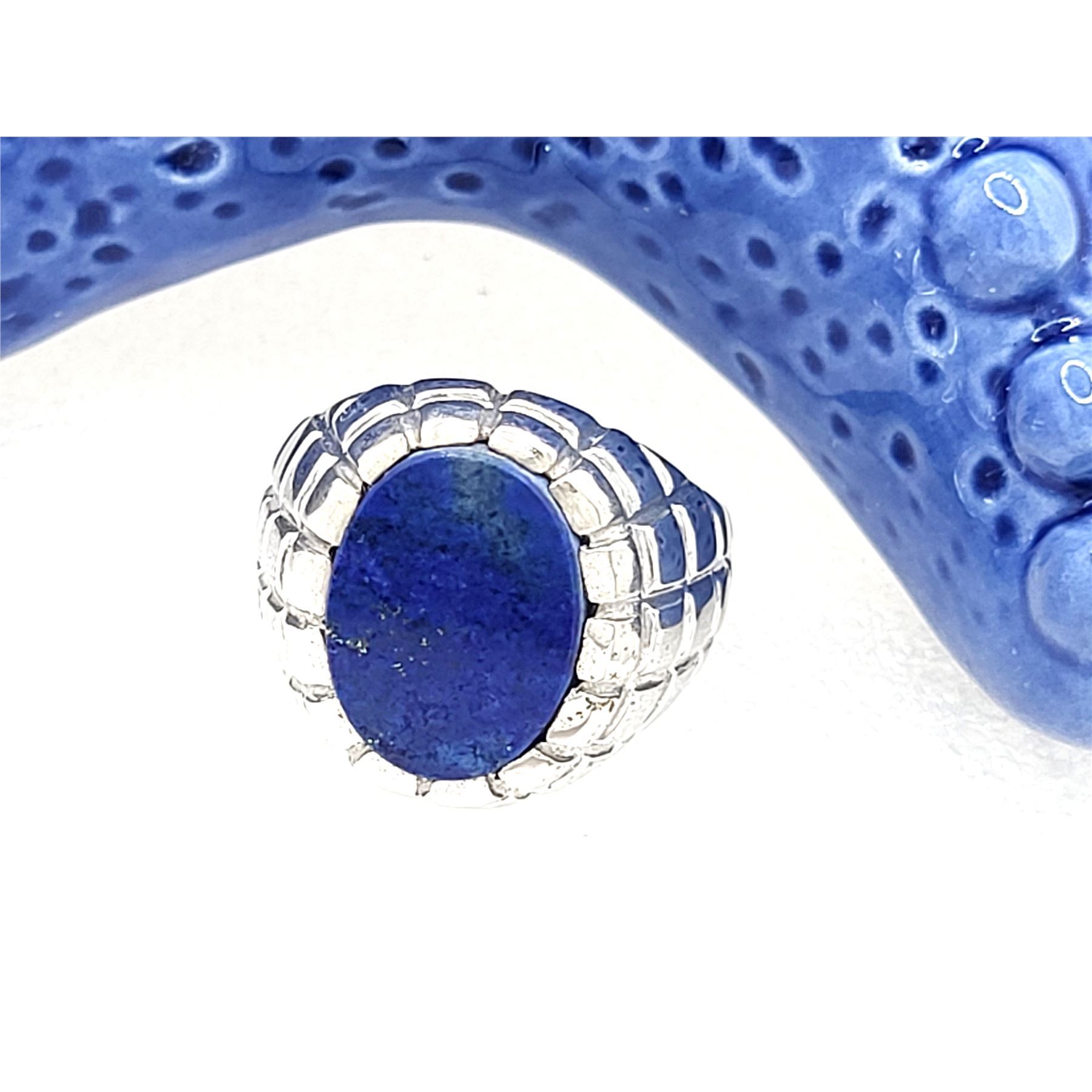 This is a sterling silver man's ring with an approximate 16mm x 12mm flat, oval, polished slice of denim lapis that is bezel set. The ring is a dome-shaped ring with a raised brick pattern. The ring has an open gallery and is approximately 20mm wide at the top, tapering to a 5 mm solid shank. It is US size 9.5 and can be sized for an additional charge. Please contact Bidfair Fine Jewelry for sizing details. This ring, like many sterling silver jewelry items, may have been manufactured or crafted with a tarnish-resistant protective coating.