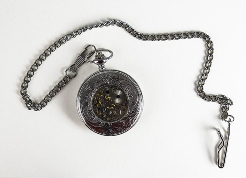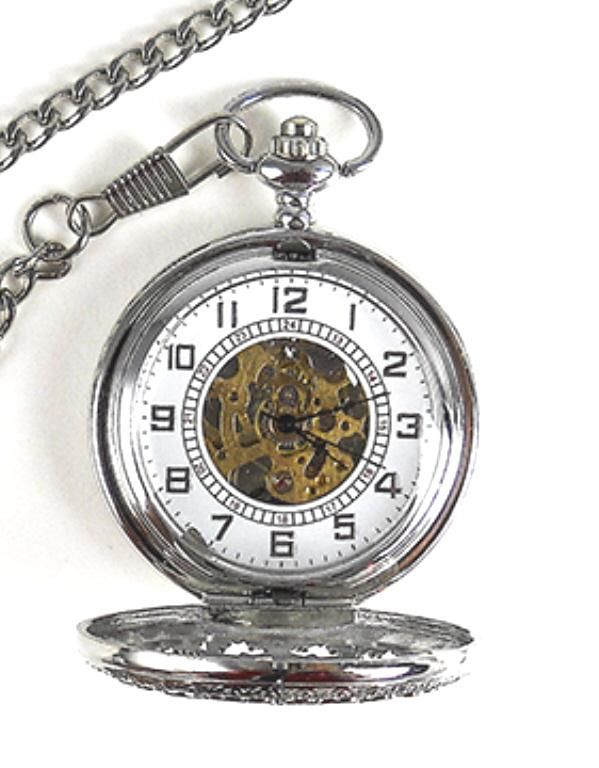 Stainless Steel Man's Pocket Watch. Case With Leaf Carvings, An Open Glass Face Exposing The Elaborate Works. Self-winding Movement. Comes With A Matching Stainless Steel Chain.