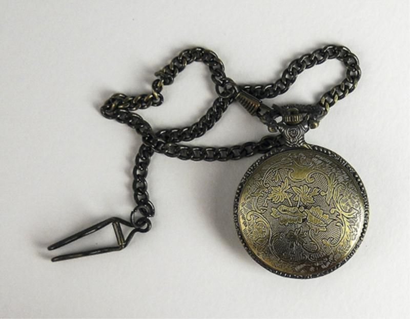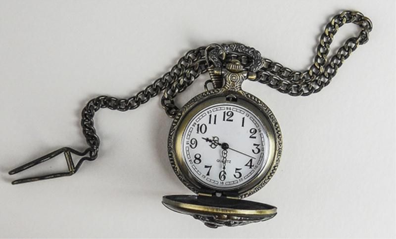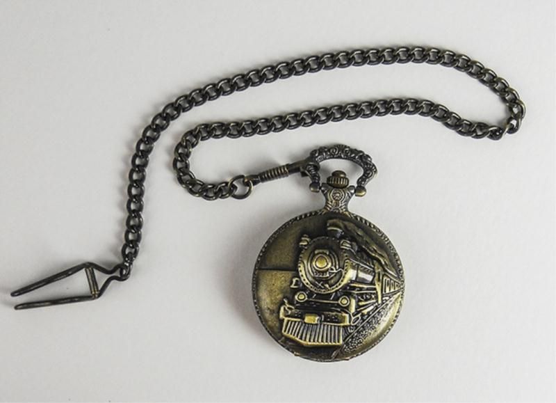 Bronze Colored Stainless Steel Men's Pocket Watch With 19th Century Locomotive On Front Of Case. This Is A Perfect Watch For Men Who Love Trains. The Watch Has A Quartz Movement And A Matching Bronze Stainless Steel Chain.