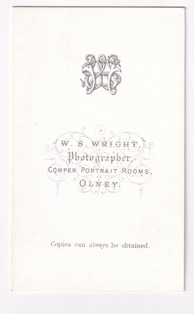 Photo was taken by W.S Wright, a photographer in Olney, Buckinghamshire at the Cowper Portrait Rooms. 1860's-1880's.
