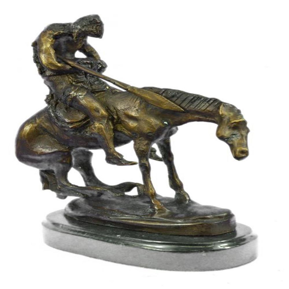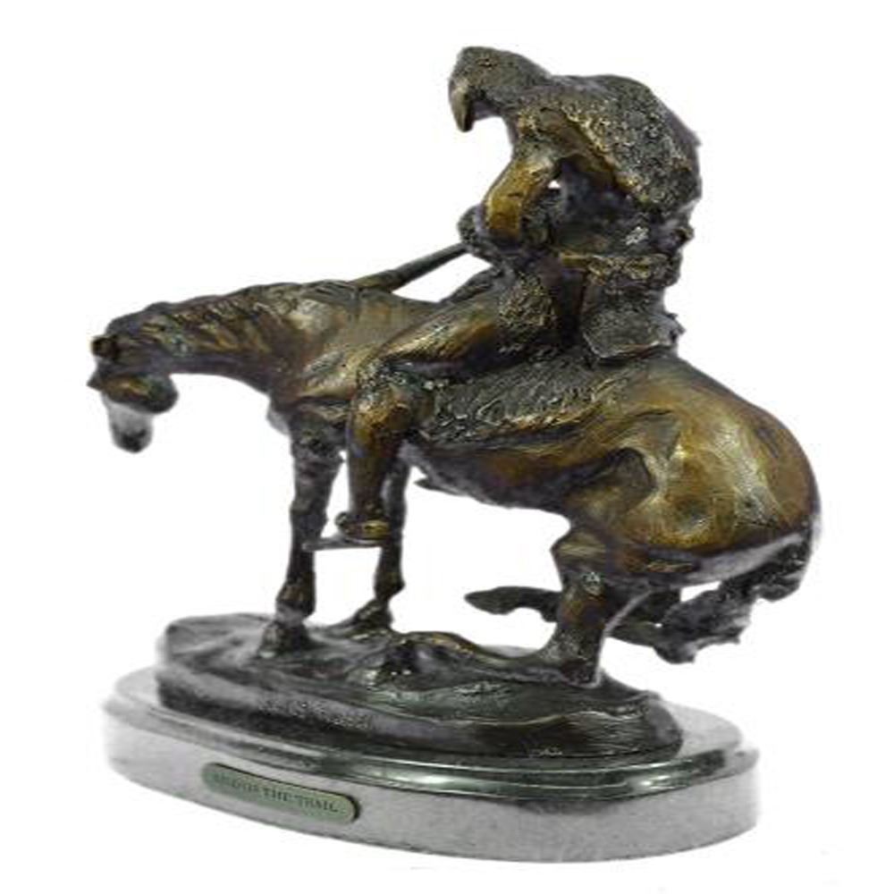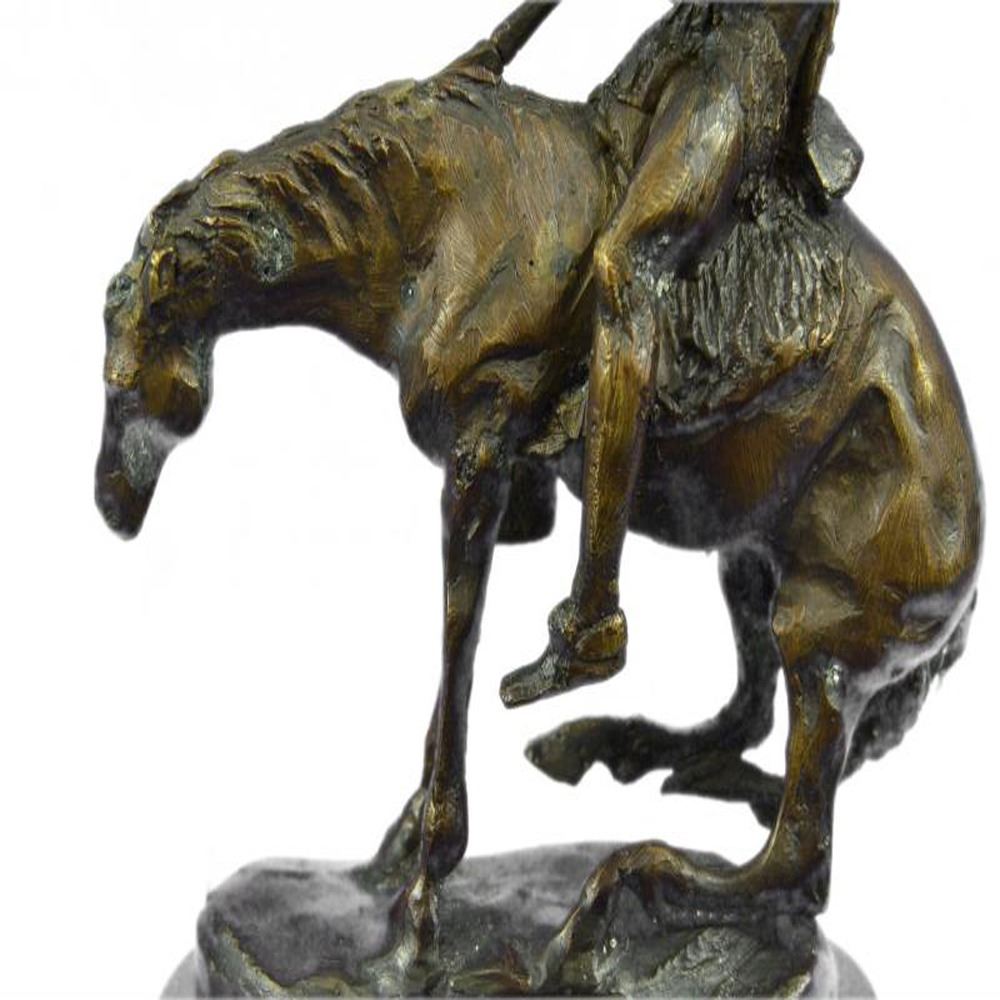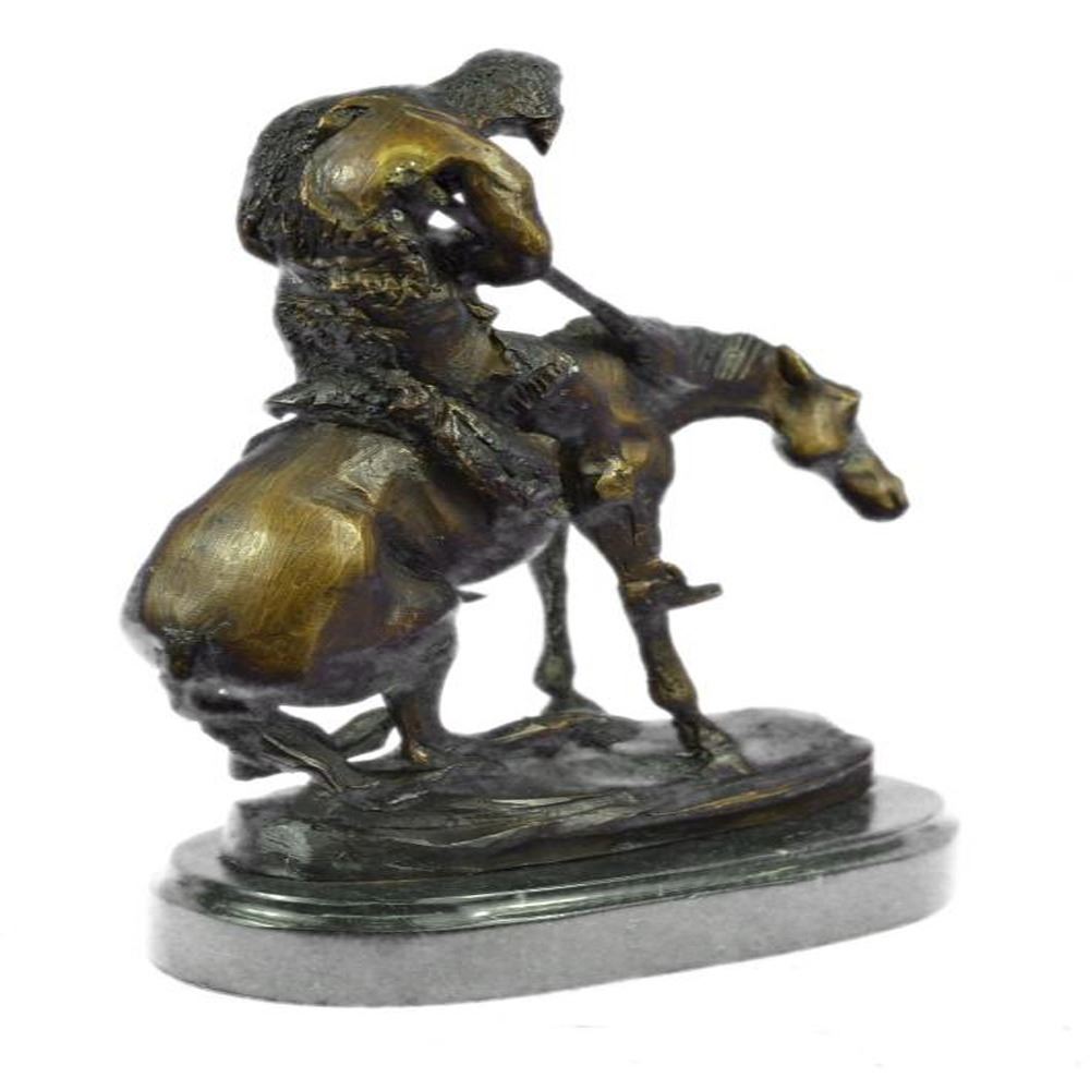 This Sculpture features a man and his horse. He has his head completely down and it appears to be that he has fallen asleep. Now, this is often the stage for horse riders, because they are usually on point when it comes to being a lookout. He has his left hand in his pocket. The stallion he rides is beyond belief beautiful and really strong, he slowly rides his owner to sleep. The handmade Bronze Sculpture was cast using the early method of lost wax casting and stained with a brown patina finish for conservation and is mounted upon a marble base. Dimensions: Height 10 X Width 9 inches. Weight: 7 LBS.