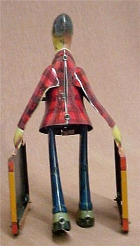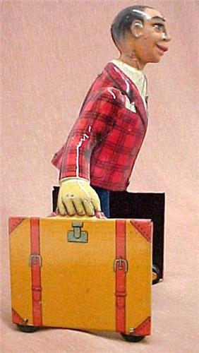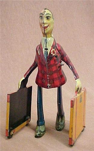 Man with Suitcases; tin wind-up toy; no maker's mark, 7" high; no winding key.