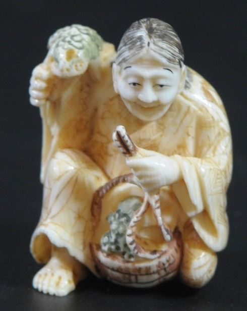 Man with basket and frogs, old ivory netsuke, hand-carved, signed: height: 4.5 cm.