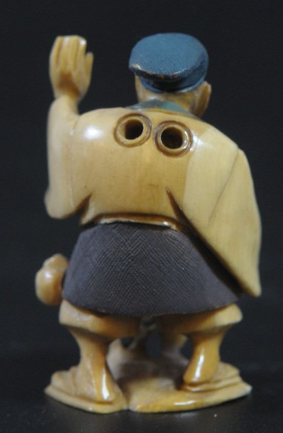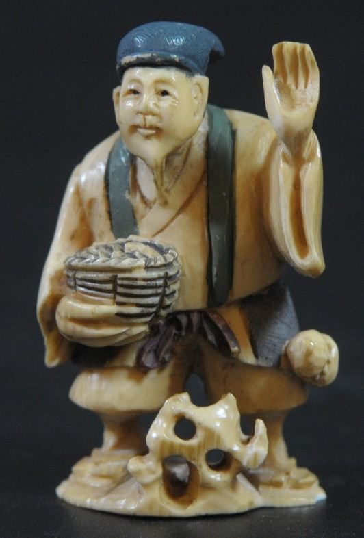 Man with basket, old ivory netsuke, hand-carved and painted, height: 4.5 cm.