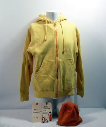 Management - Mike's (Steve Zahn) screen worn bright yellow cotton "VOS" long sleeve zip up hoodie (size M), and orange wool cap. Includes wardrobe tags!