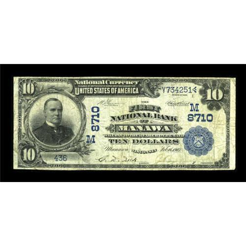 <B>Manawa, WI</B></I> - $10 1902 Date Back Fr. 618 <B>The First NB</B></I> Ch. # (M)8710<BR> A nice, evenly circulated example from a difficult to find bank. Pleasing <B>Fine.</B></I><BR><BR><b>Shipping:</b> Coins & Currency (<a target="_blank" href="http://www.heritageauctions.com/common/shipping.php">view shipping information</a>)