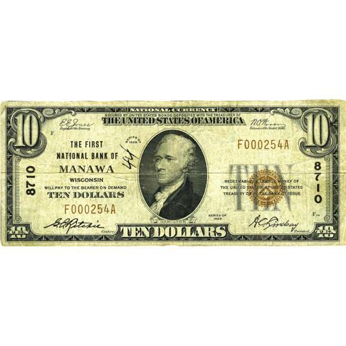 <B>Manawa, WI</B></I> - $10 1929 Ty. 1 <B>The First NB</B></I> Ch. # 8710<BR>This nice <B>Fine</B></I> is only the fifth example of this type and denomination to be documented from here. The digits "44" appear in blue ink to the left of the portrait. Given the current level of interest in better Wisconsin material, this note from the only issuer in town will likely sell for...