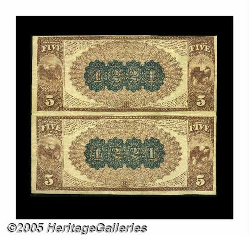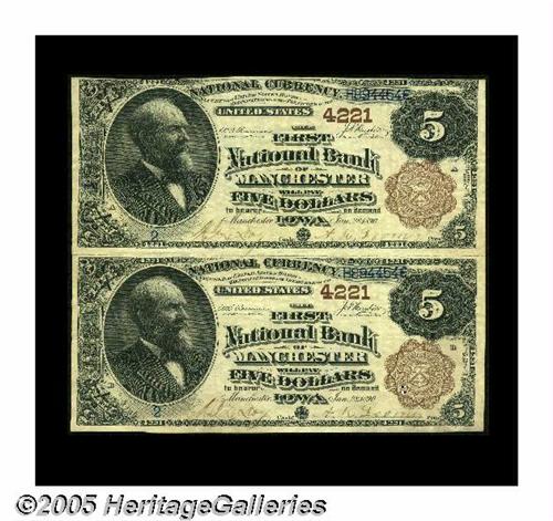 <B>Manchester, IA</B></I> - $5 1882 Brown Back Fr. 471 <B>The First NB</B></I> Ch. # 4221<BR>While six notes from this rare one bank community are listed in the census, most all have been closely held for years, with the Gengerke data showing only three offerings of any kind from here during the past sixty years. This uncut pair of serial number 2 $5 Brown Backs is new to the market, having been discovered earlier this year in a West Coast estate. There is a fold between the notes, but both of these pen-signed examples grades <B>Crisp Uncirculated,</B></I> with each displaying a few paper ripples caused by many years of storage. Expect this rare and beautiful pair to realize in the area of...