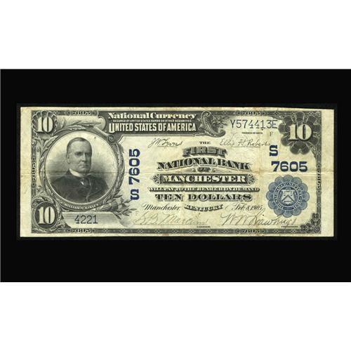 <B>Manchester, KY</B></I> - $10 1902 Plain Back Fr. 624 <B>The First NB</B></I> Ch. # (S)7605<BR>One of a pair of nice large size notes from this small SE Kentucky community. The census shows just ten large examples extant, all but one Blue Seals. Nice <B>Fine-Very Fine,</B></I> with sharp pen signatures.