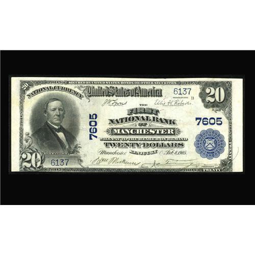 <B>Manchester, KY</B></I> - $20 1902 Plain Back Fr. 650 <B>The First NB</B></I> Ch. # 7605<BR>A higher grade $20 rounds out the selection of Manchester notes in the Gale holdings. <B>Very Fine+.</B></I>