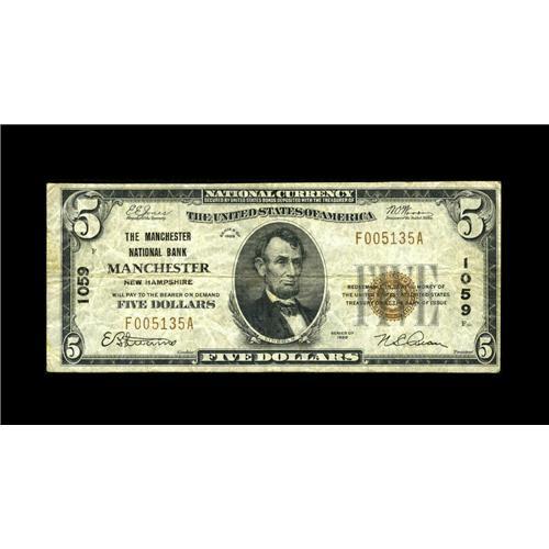 <B>Manchester, NH</B></I> - $5 1929 Ty. 1 <B>The Manchester NB</B></I> Ch. # 1059<BR>A clean and unmolested <B>Fine-Very Fine</B></I> that is one of just six of this type and denomination known to survive from here. Manchester was at one time the site of the world's largest textile factory.