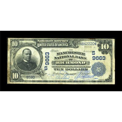<B>Richmond, VA</B></I> - $10 1902 Plain Back Fr. 628 <B>The Manchester NB</B></I> Ch. # <BR>9S)9663<BR> This bank originally organized in Manchester, a suburb of Richmond which later became part of the City of Richmond. It was only in business for eight years, using the Manchester location for just the first two. This becomes the second surviving example known, and the first $10 Plain Back reported carrying the Second Title used. Some light staining is noticed along with some minor rust in the margins is more than offset by the strong signatures. Let scarcity be your guide and expect a realization for this <B>Fine</B></I> note in the area of...<BR><BR><b>Shipping:</b> Coins & Currency (<a target="_blank" href="http://www.heritageauctions.com/common/shipping.php">view shipping information</a>)