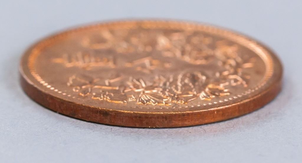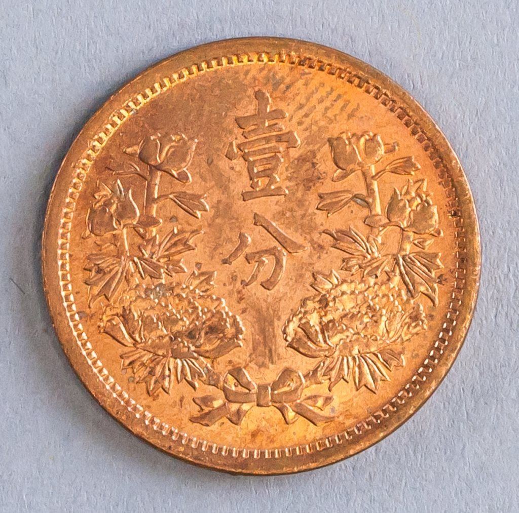 Manchoukuo coin. Obverse: Flag in pearl surrounded by text. Lettering: DA MAN ZHOU GUO / KANG DE LIU NIAN. Reverse: Value in floral sprays. YI FEN. 2.5 cm. 5 grams.