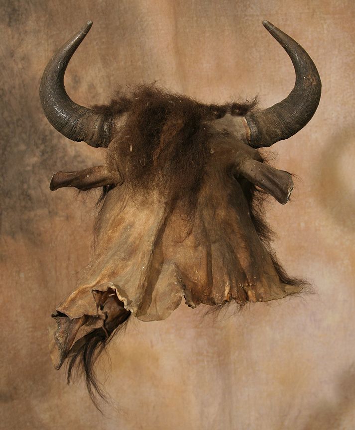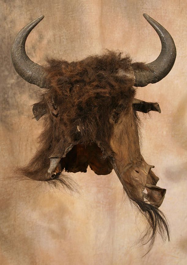 Mandan Buffalo Dance Mask. 20" x 20". Hide is untanned parfleche, some hair still intact. The Mandan called the buffalo to “come to the village” in a Buffalo Dance ceremony at the beginning of each summer. 19th century. RARE!. (est. $4,000-6,000). Provenance: The Ralph & Rowena Meyers Collection. CONDITION REPORTS: www.auctioninsantafe.com/docs/cr2012.pdf