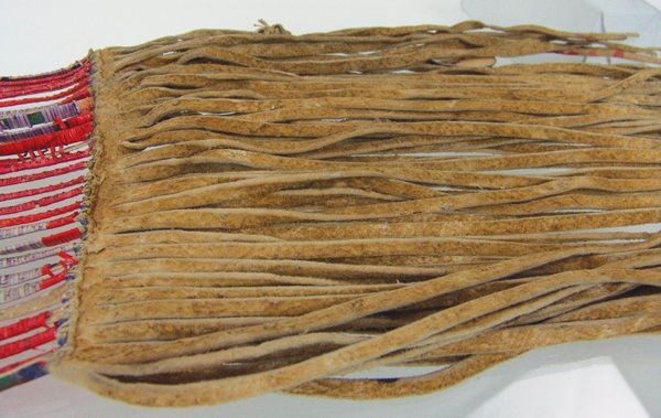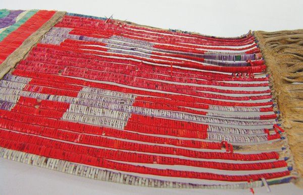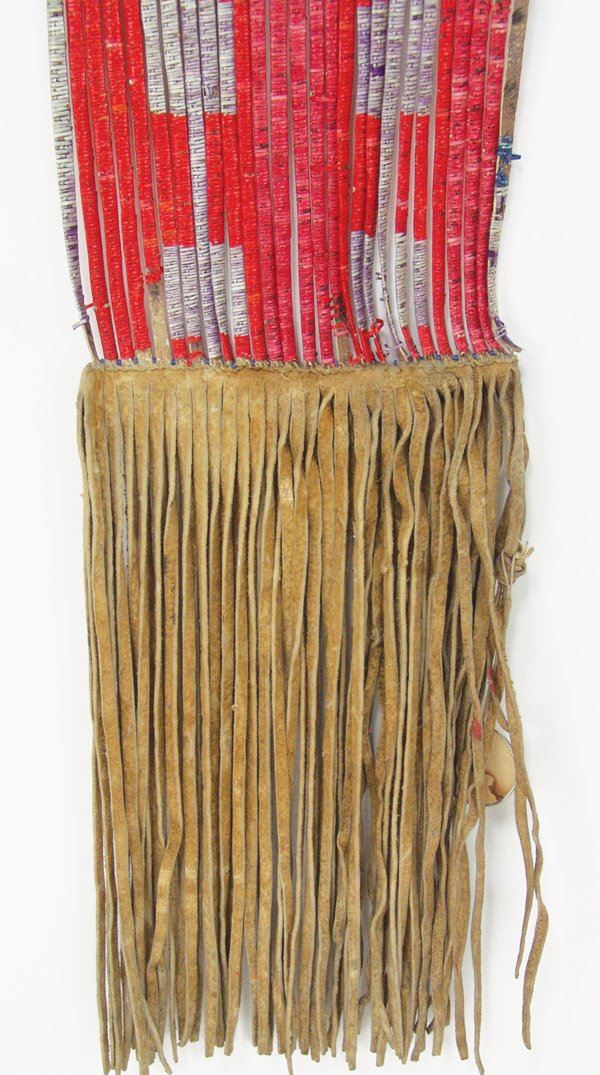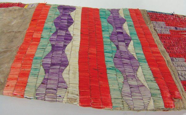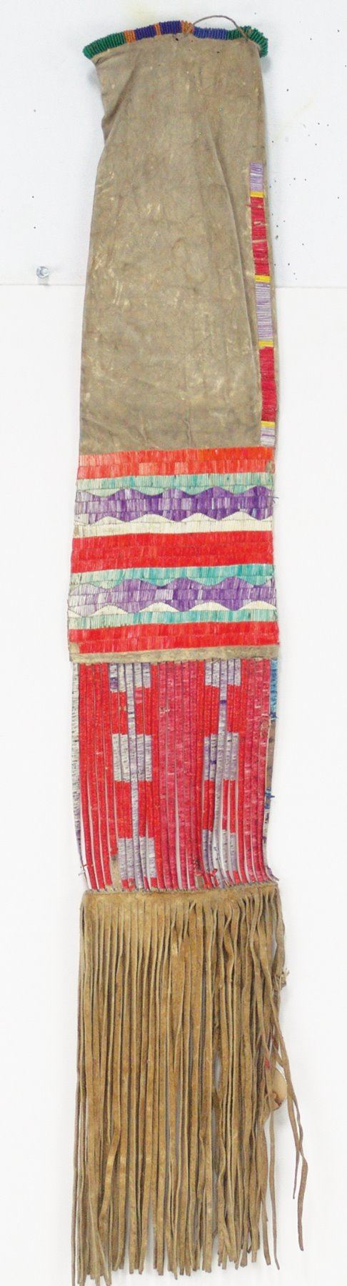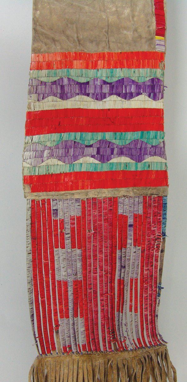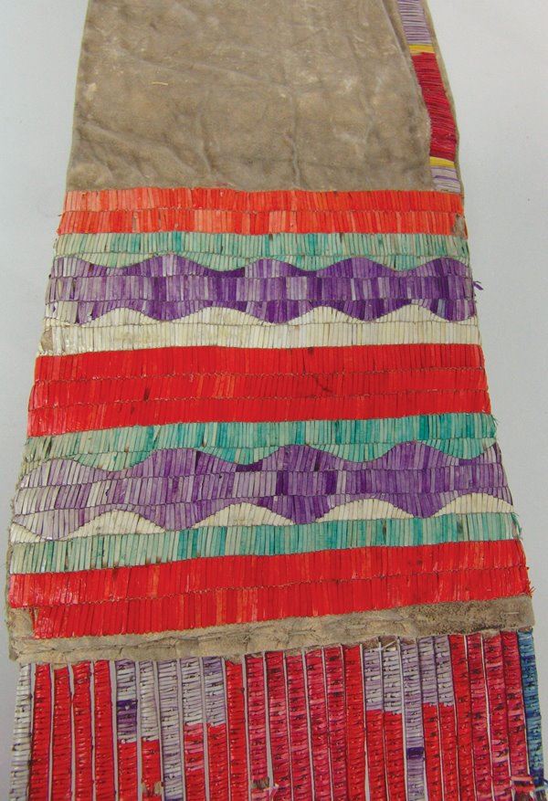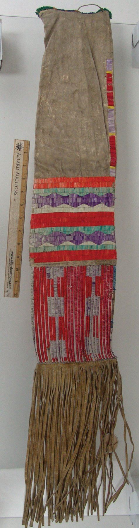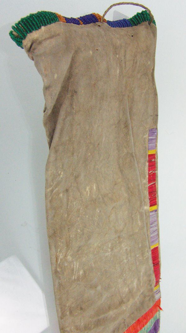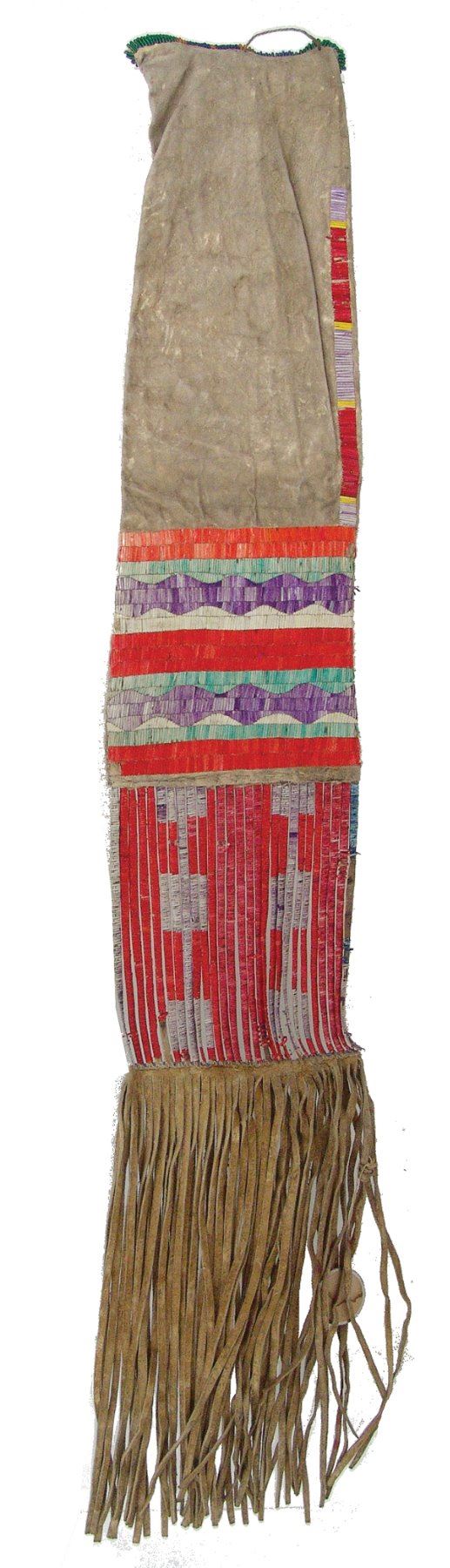 Exceptional and rare, two-sided deer hide pipe/tobacco bag the body, slats, and trim expertly done in flattened and dyed porcupine quill, with an unusual design, and with later added moose hide fringe. Very good condition, very minor quill loss.