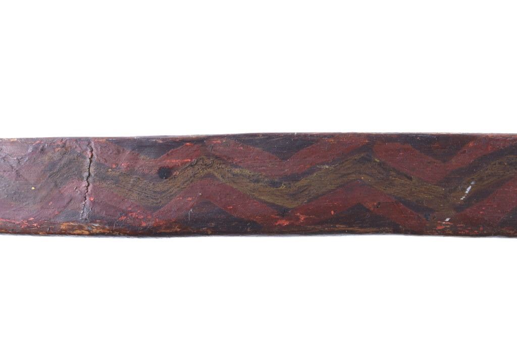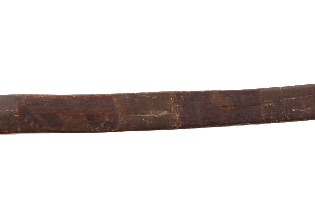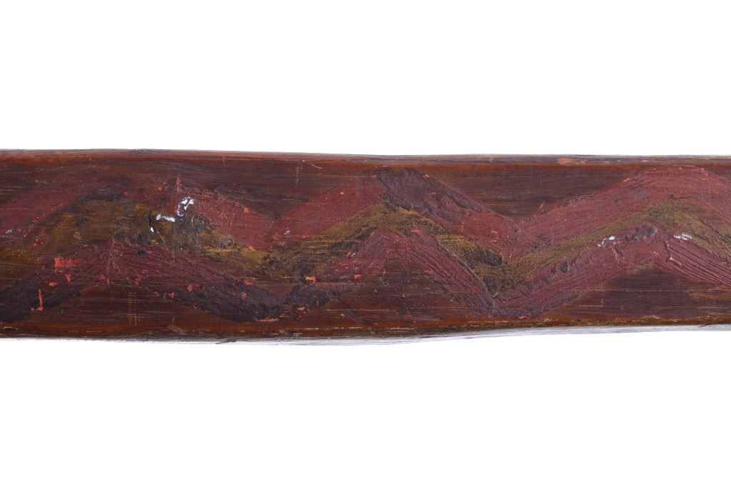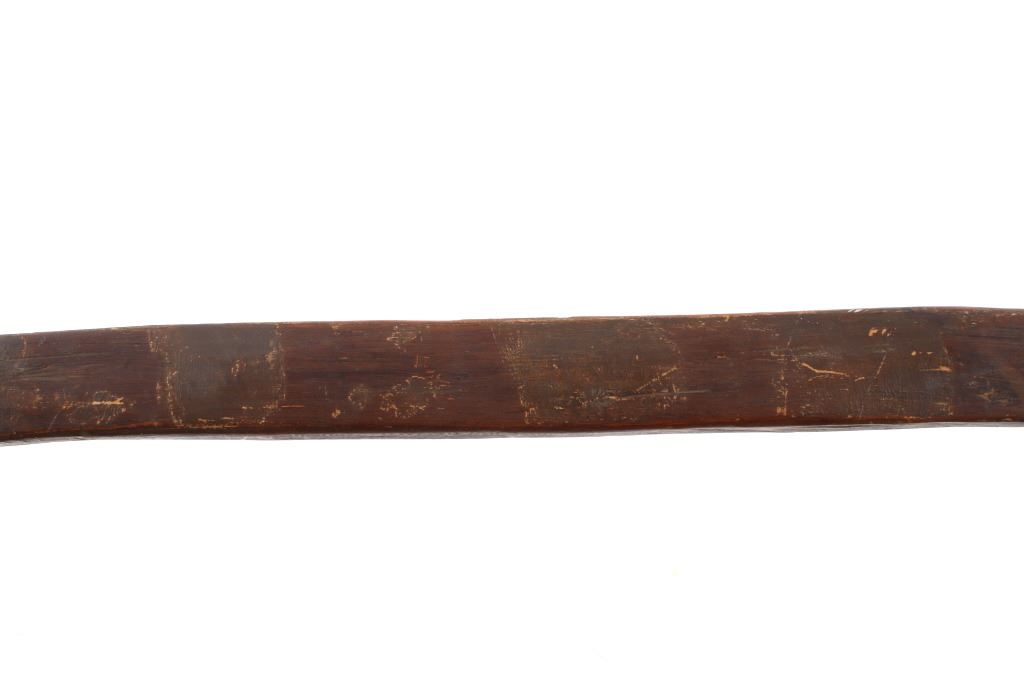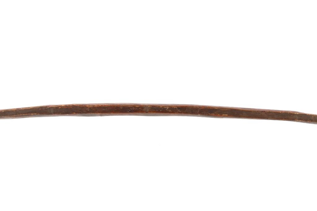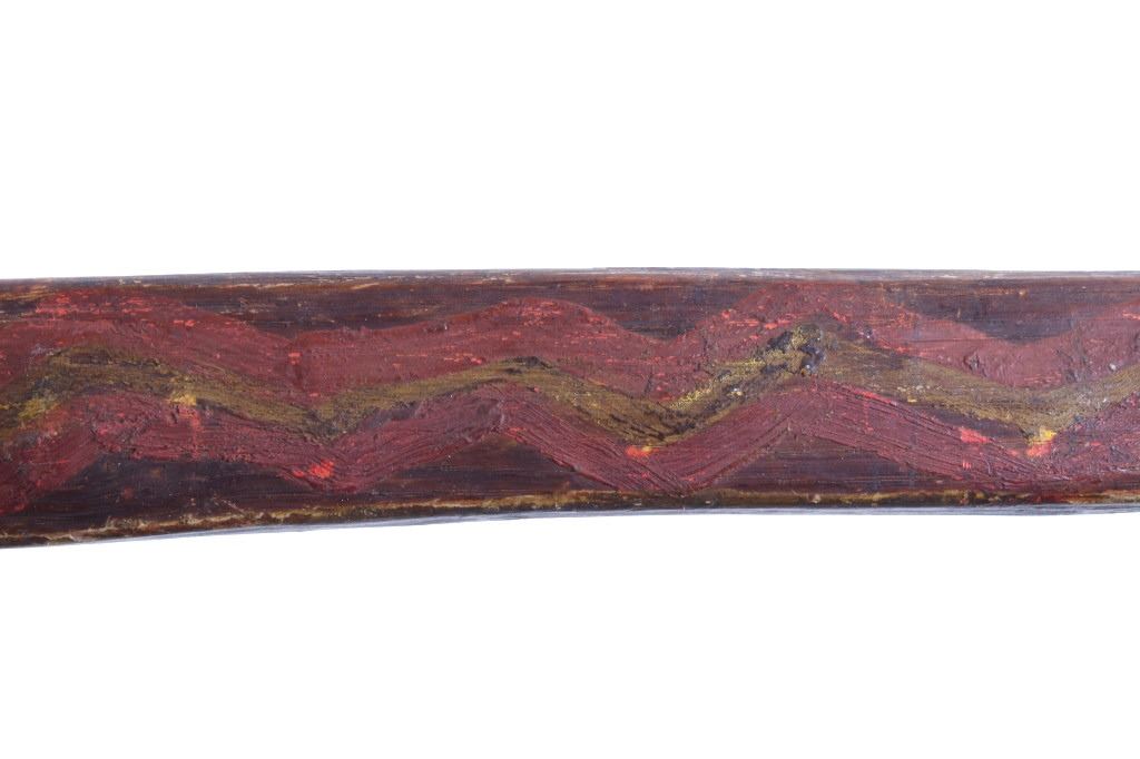 This is an excellent carved wood polychrome painted bow from the Mandan Hidatsa Native Americans of the Missouri River region dating to the mid-19th Century. The piece shows a curved wood warrior’s bow which is expertly carved showing well made notches at the end, tapering design and slightly recurved pattern. The entire bow shows a brown pigment mineral paint with the outside edge showing a zig-zag river like red and yellow polychrome mineral pigment paint which extends the entity of the bow. On the inside edge a banded painted design. The bows is very similar to the example collected in 1845 from the Mandan of the Upper Missouri River at Fort Clark sold in our June 2020 sale and valued at $6,000. The piece shows very well-preserved condition and exceptional rare paint. Provenance: From a historic Eastern Montana American Indian Collection, where the piece was found to be an authentic original, one of the finest collections of American Indian weaponry and antiquities in Montana. Measures 49”L end to end and is about 1.5” by 1” thick.
