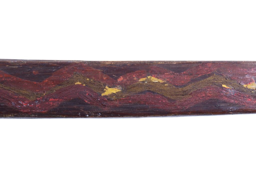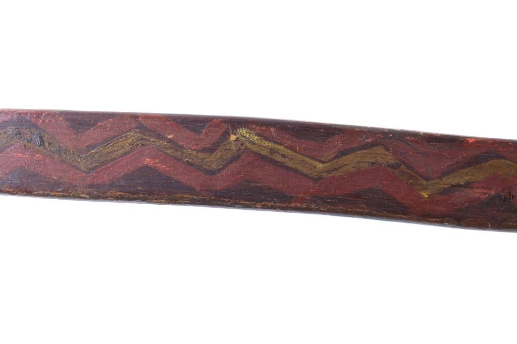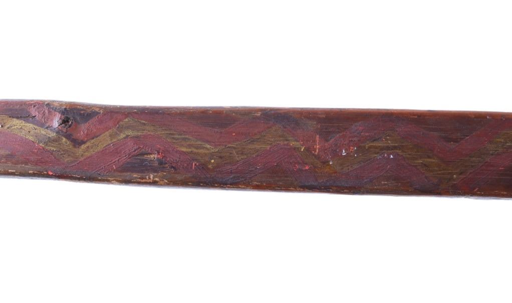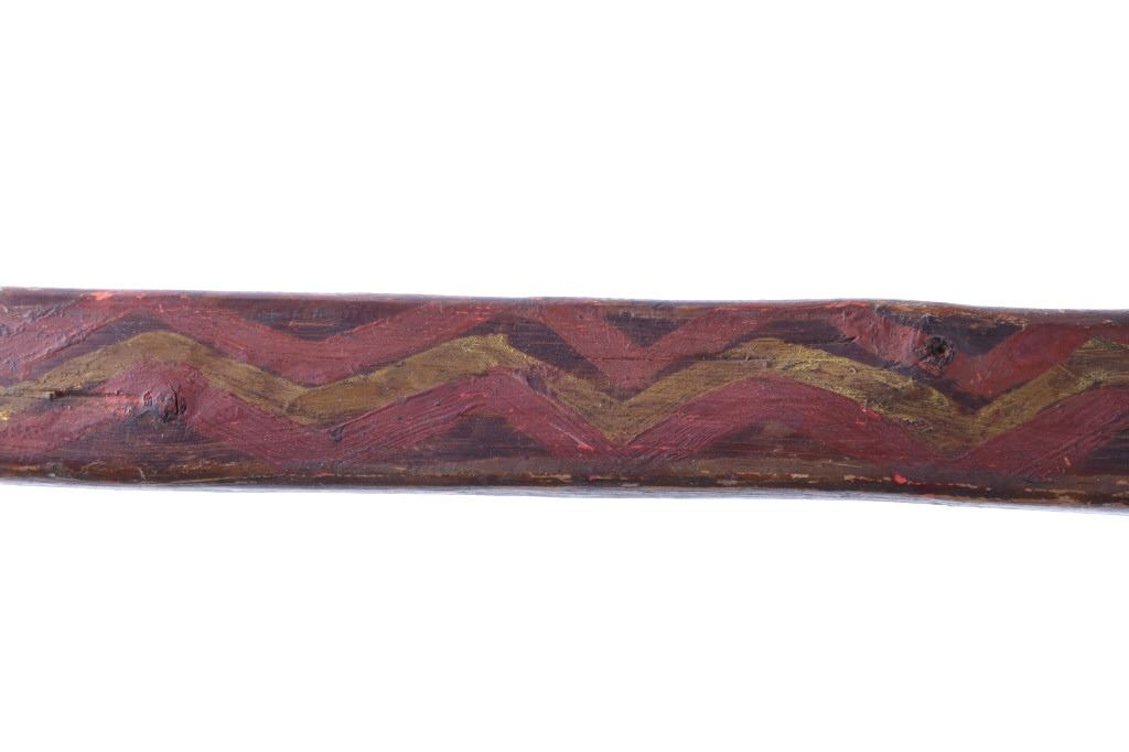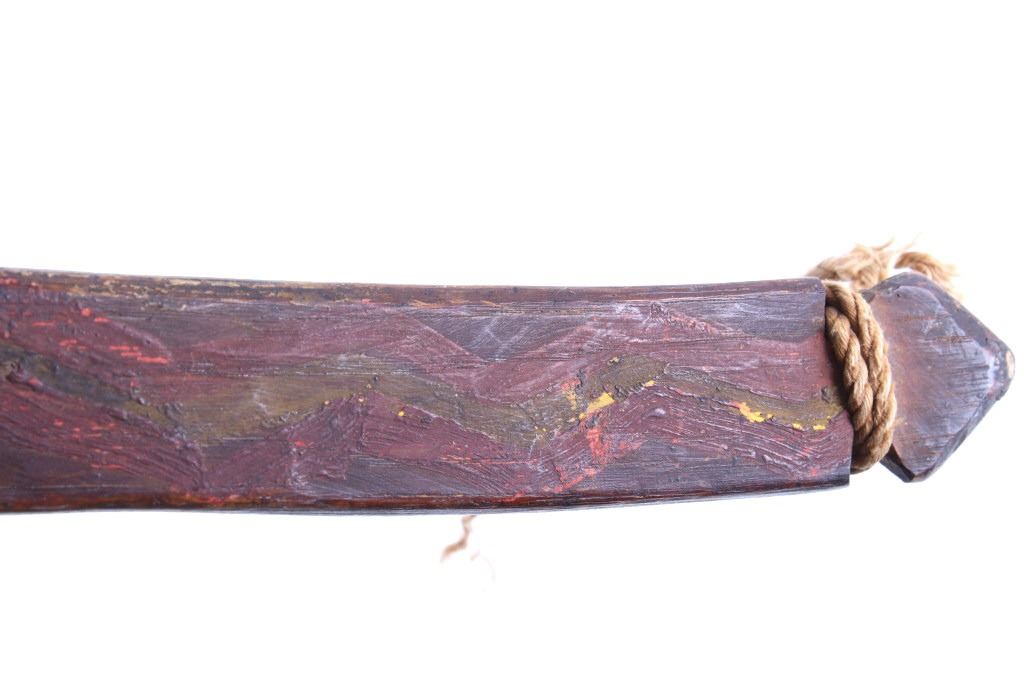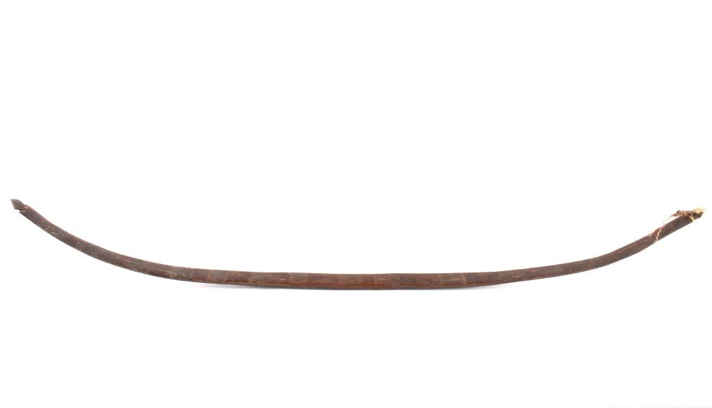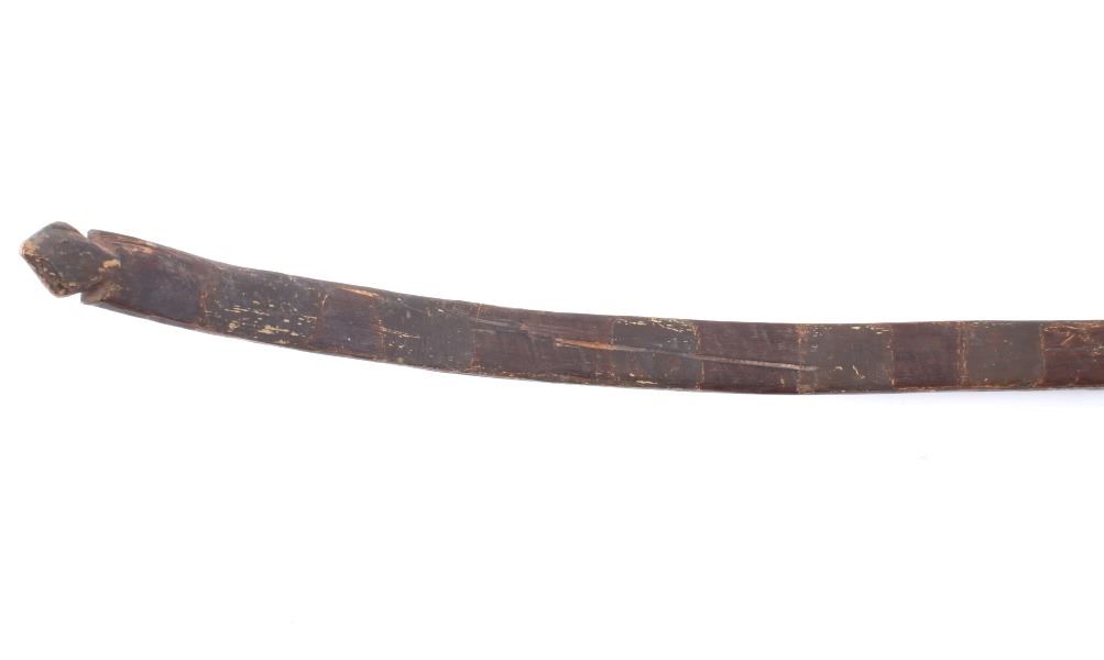 This is an excellent carved wood polychrome painted bow from the Mandan Hidatsa Native Americans of the Missouri River region dating to the mid-19th Century. The piece shows a curved wood warrior’s bow which is expertly carved showing well made notches at the end, tapering design and slightly recurved pattern. The entire bow shows a brown pigment mineral paint with the outside edge showing a zig-zag river like red and yellow polychrome mineral pigment paint which extends the entity of the bow. On the inside edge a banded painted design. The bows is very similar to the example collected in 1845 from the Mandan of the Upper Missouri River at Fort Clark sold in our June 2020 sale and valued at $6,000. The piece shows very well-preserved condition and exceptional rare paint. Provenance: From a historic Eastern Montana American Indian Collection, where the piece was found to be an authentic original, one of the finest collections of American Indian weaponry and antiquities in Montana. Measures 49”L end to end and is about 1.5” by 1” thick.