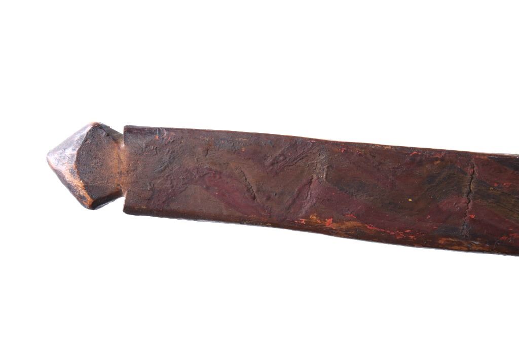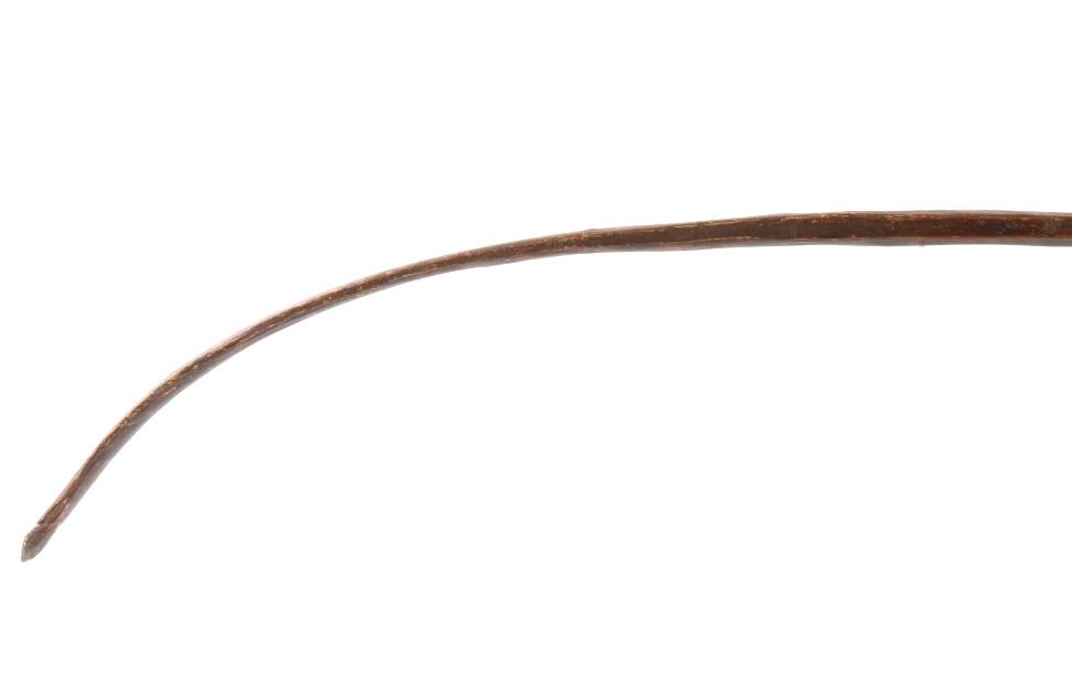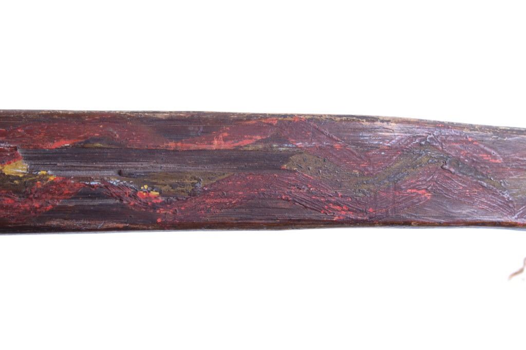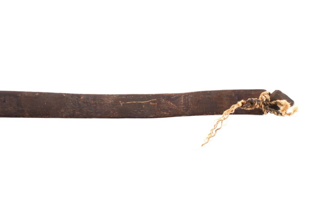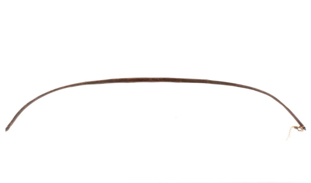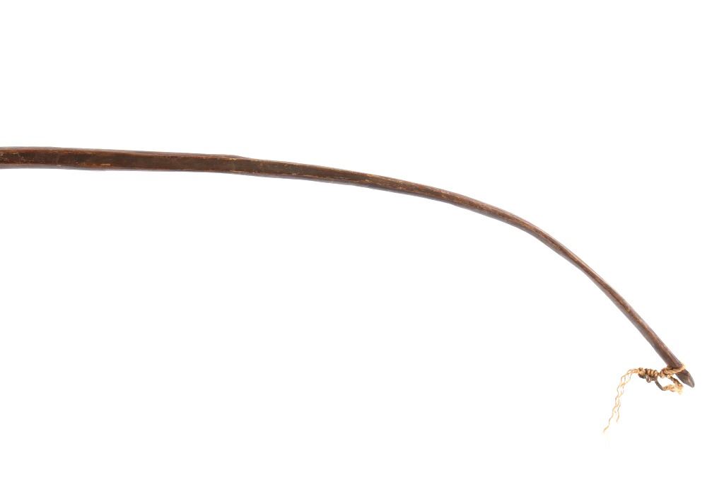 This is an excellent carved wood polychrome painted bow from the Mandan Hidatsa Native Americans of the Missouri River region dating to the mid-19th Century. The piece shows a curved wood warrior’s bow which is expertly carved showing well made notches at the end, tapering design and slightly recurved pattern. The entire bow shows a brown pigment mineral paint with the outside edge showing a zig-zag river like red and yellow polychrome mineral pigment paint which extends the entity of the bow. On the inside edge a banded painted design. The bows is very similar to the example collected in 1845 from the Mandan of the Upper Missouri River at Fort Clark sold in our June 2020 sale and valued at $6,000. The piece shows very well-preserved condition and exceptional rare paint. Provenance: From a historic Eastern Montana American Indian Collection, where the piece was found to be an authentic original, one of the finest collections of American Indian weaponry and antiquities in Montana. Measures 49”L end to end and is about 1.5” by 1” thick.
