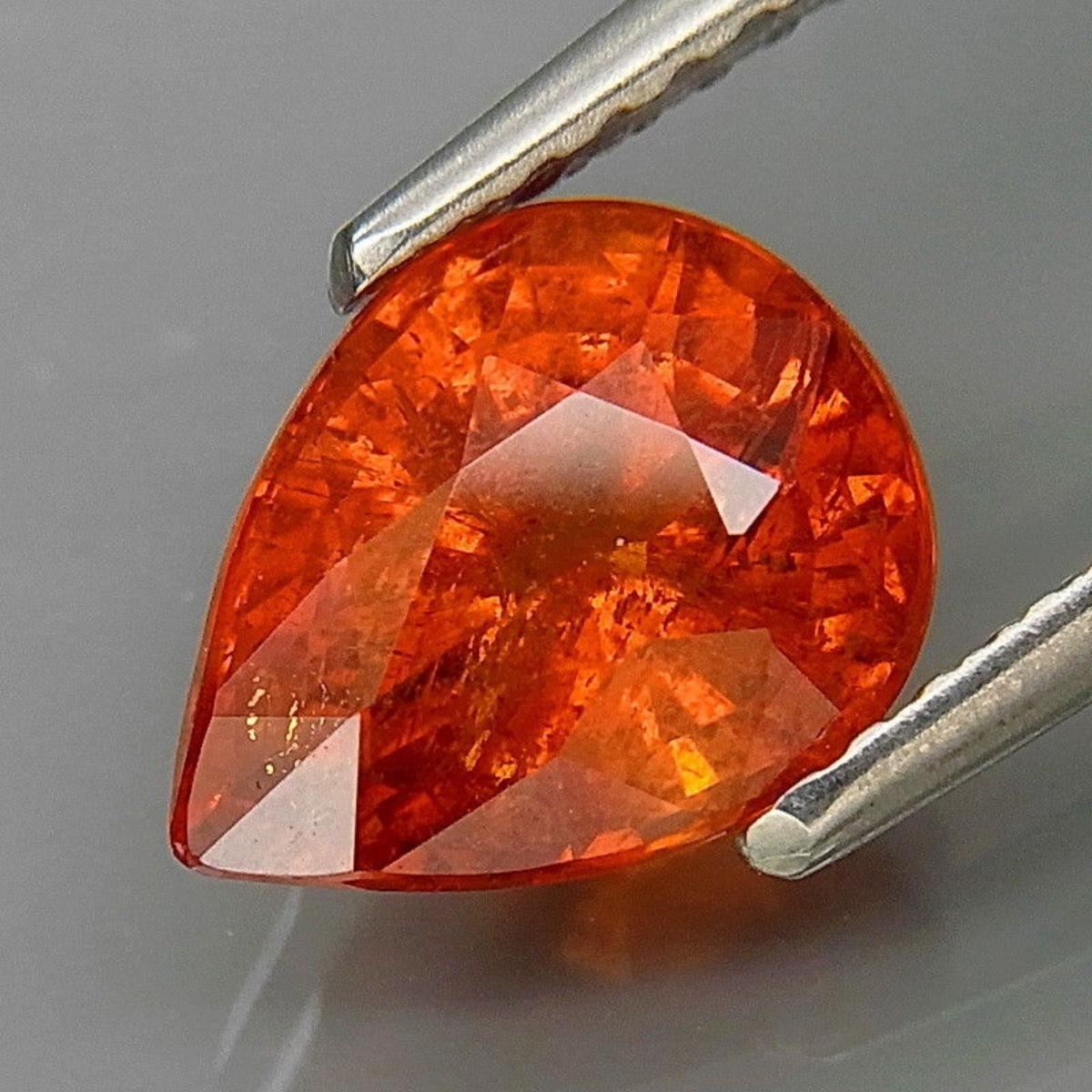 Spessartite Garnet SHAPE Pear Shape WEIGHT 2.17 Ct. SIZE 8.5 X 6.5 X 5 mm QUANTITY 1 Piece COLOR Fire Mandarin Orange CLARITY SI; LUSTER Superior ORIGIN Namibia; TREATMENT None HARDNESS 7 -7.5