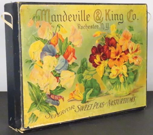 Mandeville & King Cardboard Store Display Box. Original paper label on top and interior lid. Superior Sweet Peas and Nasturtiums. Tears at corners, labels in very good condition. 11 1/4 X 2 X 8 inches (closed).
