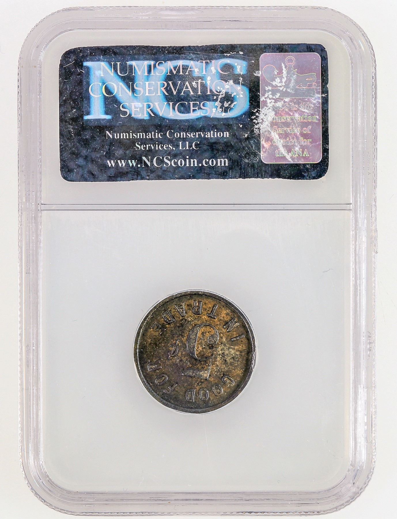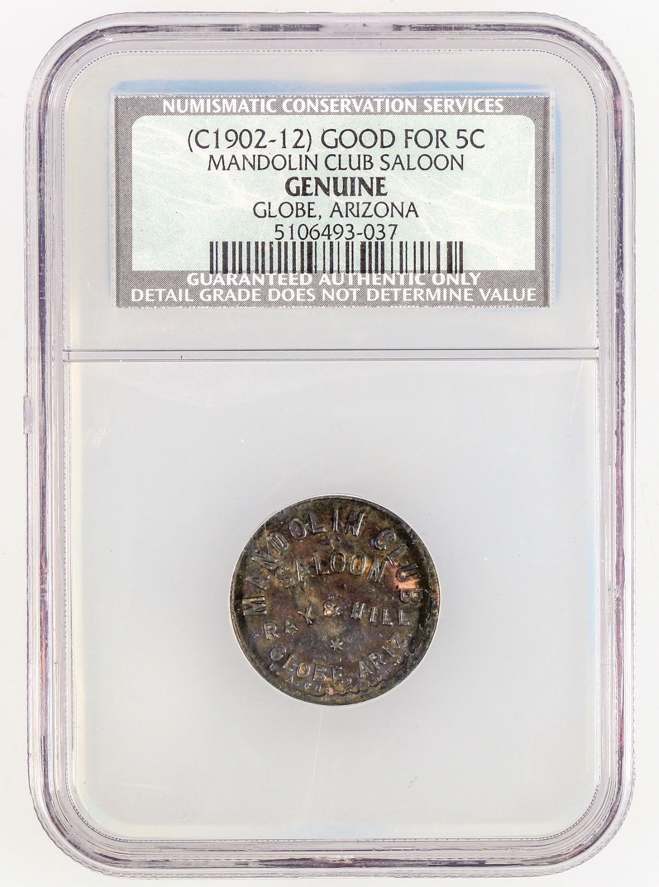 Numismatic Conservation Services certified Genuine: MANDOLIN CLUB / SALOON / RAY & HILL / GLOBE, ARIZ. / L.A. RUB. STAMP CO. // GOOD FOR / 5& #3586; / IN TRADE; Br., rd., 21 mm.
