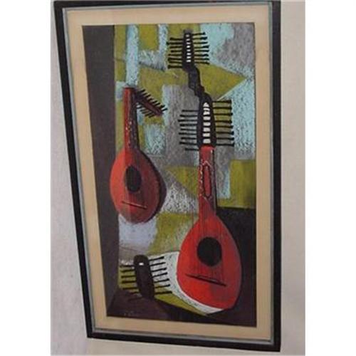 Framed artwork 16 1/2" x 28 1/2'', two Mandolins suspended in mid air against a green and blue background, hand painted. Very well done.