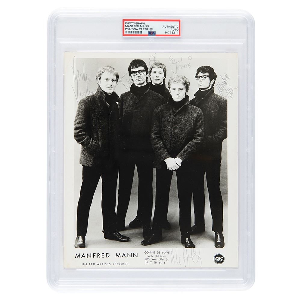 Glossy 8 x 10 United Artists Records publicity photo of Manfred Mann posing together in matching coats and slacks, signed in black ballpoint by Manfred Mann, Mike Hugg, Paul Jones, Mike Vickers, and Tom McGuinness. In fine condition, with a crease to the upper left corner. Encapsulated in a PSA/DNA authentication holder.