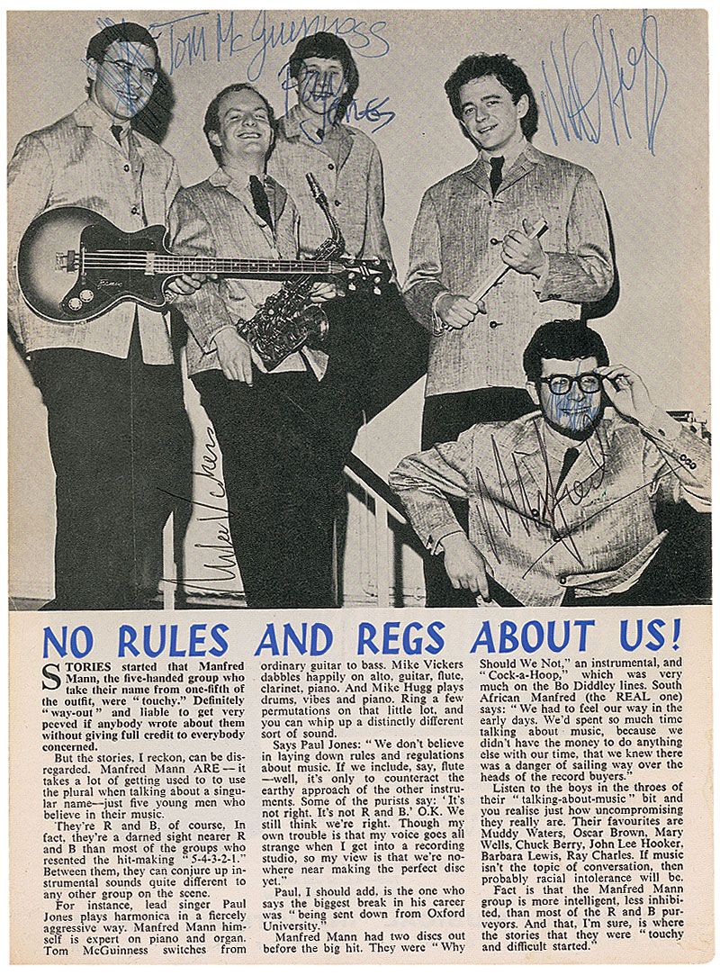 Vintage 7 x 9.5 magazine photo, signed in blue and black ballpoint by Manfred Mann, Mike Hugg, Paul Jones, Tom McGuinness, and Mike Vickers. It appears that one of the band members has jokingly scribbled over two of the faces. In fine condition, with a few light creases.