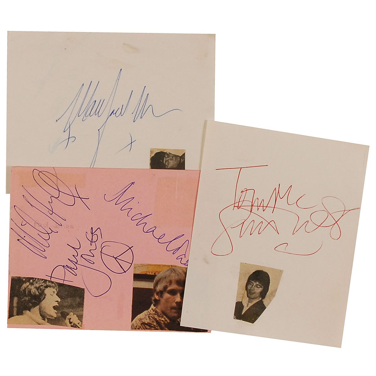Vintage ballpoint signatures of Manfred Mann, Tom McGuinness, Paul Jones, Mike Hugg, and Michael d’Abo on three 5.25 x 4 album pages, with clipped photos affixed near signatures and a few pencil notations. Scattered toning and soiling, a paperclip impression to one page, and a few wrinkles, otherwise fine condition. Accompanied by a certificate of authenticity from Tracks.