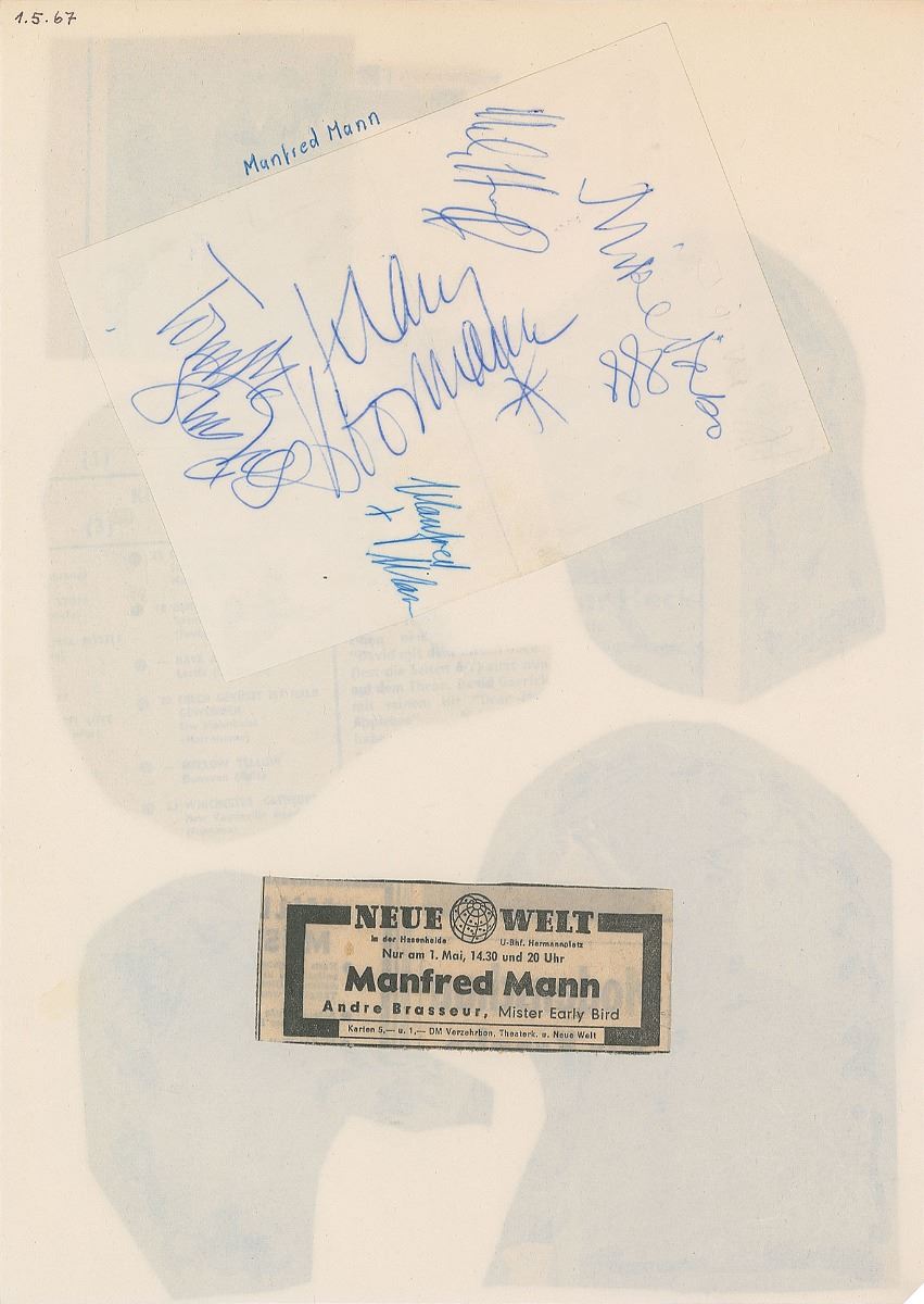 Vintage ballpoint signatures of Klaus Voormann, Tom McGuinness, Mike Hugg, Mike d’Abo, and Manfred Mann on an off-white 5.75 x 4 sheet affixed to a larger album sheet bearing affixed clippings to front and reverse. In fine condition, with intersecting folds. Collector’s ink notations in upper left corners indicate that the signatures were obtained on May 1, 1967.