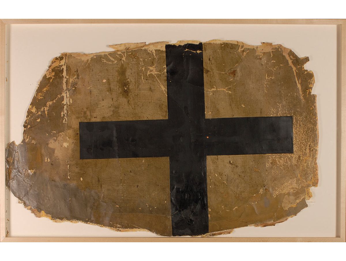 Gigantic and very rare section of aircraft fabric taken from one of von Richthofen’s fighter aircrafts. The section of lacquered fabric measures 32 x 19.5, with a large (21 x 19) Balkankreuz (Greek Cross) painted in black dominating the fabric, against a dull green background, and was most likely taken from the rudder area of the aircraft. This style of cross was prevalent on German Air Service aircraft from early 1918 until the end of the war. Fabric has been professionally dry mounted, which has since come loose, and framed under UV glass to an overall size of 34.5 x 22.25. Expected distress, with several period patches and touch-ups, crazing and some cracking to some areas of paint, with several areas of the cross having been professionally retouched recently, and some chipping to irregular edges, otherwise very good condition.