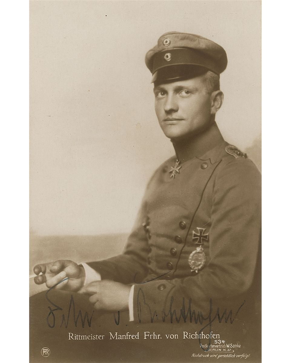 Fabled German military pilot (1892–1918) who shot down 80 enemy planes in World War I before he was killed in action at age 25. Rare vintage 3.25 x 5.25 postcard photo of von Richthofen in military dress, signed in fountain pen, “Fr. M. v. Richthofen.” In fine condition. Von Richthofen did not become well known enough to be asked for autographs until 1916, and he was killed just two years later. In between, he was usually in combat at the front and, in any case, a veritable recluse, so very few people were given the chance to meet him. The combination of these circumstances accounts for the extraordinary rarity of this most coveted of military and aviation personalities.