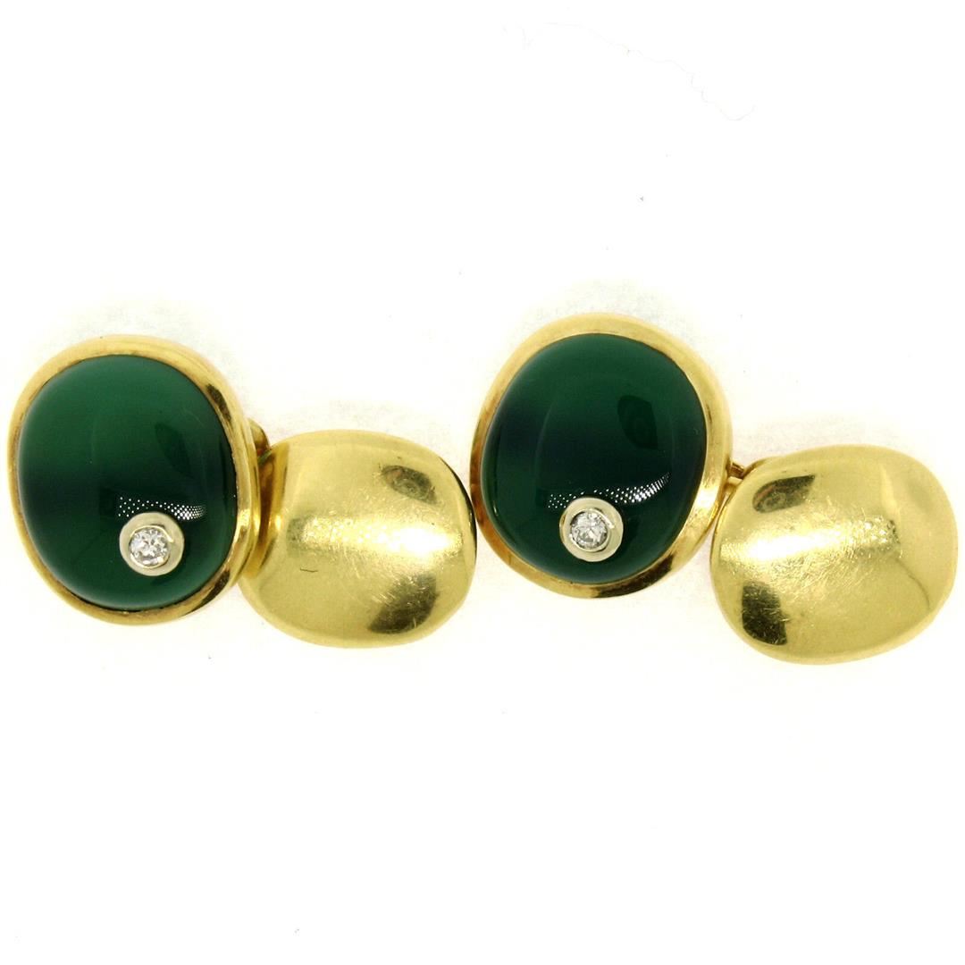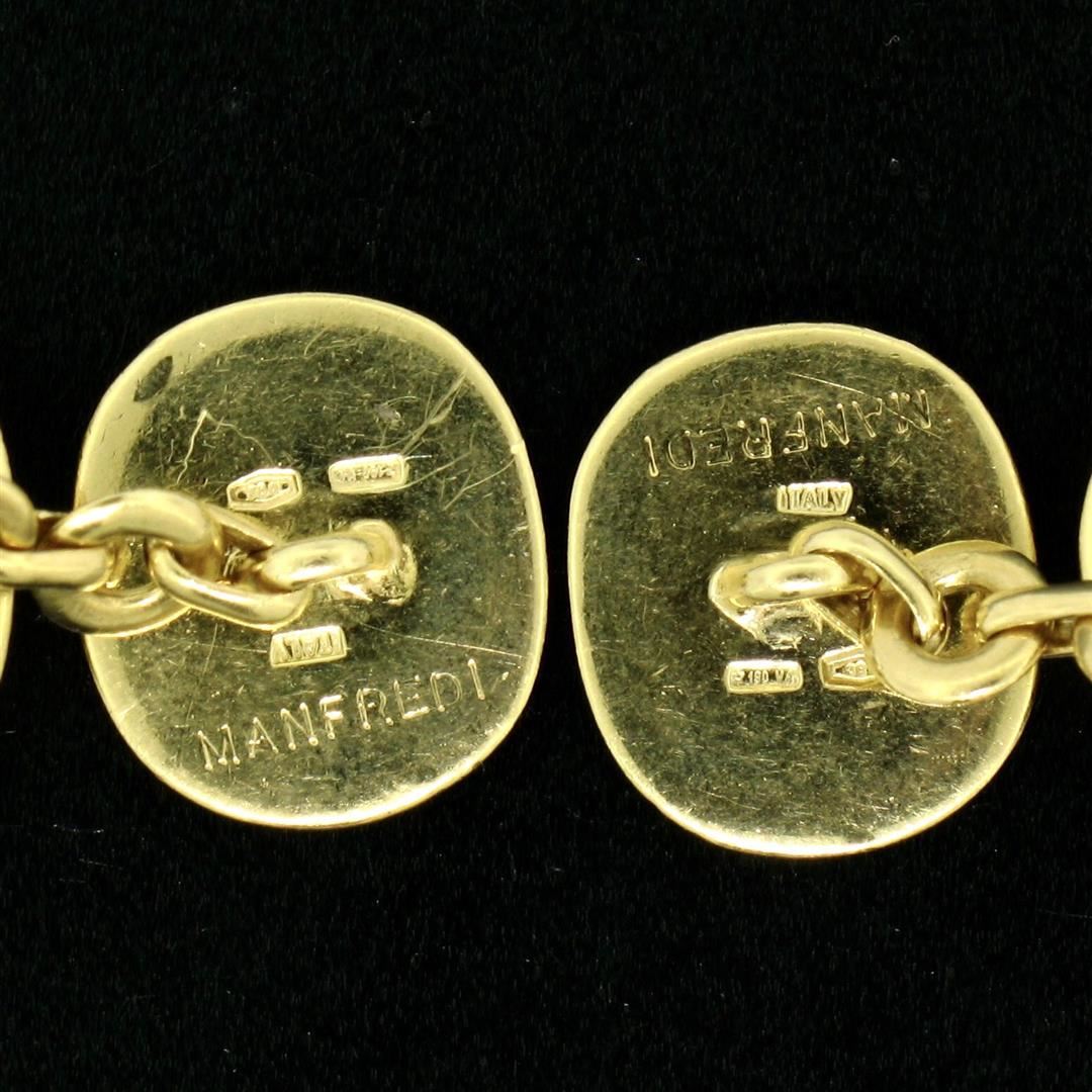 A solid 18k yellow gold cufflinks by Manfredi, with 2 cushion cabochon cut natural chrysoprase (13.5x11.9mm), and 2 round brilliant cut natural diamonds (VS1 ; E - 0.05ctw). These cuff links have a chain link design with a clearance of 17.40mm, weigh a t