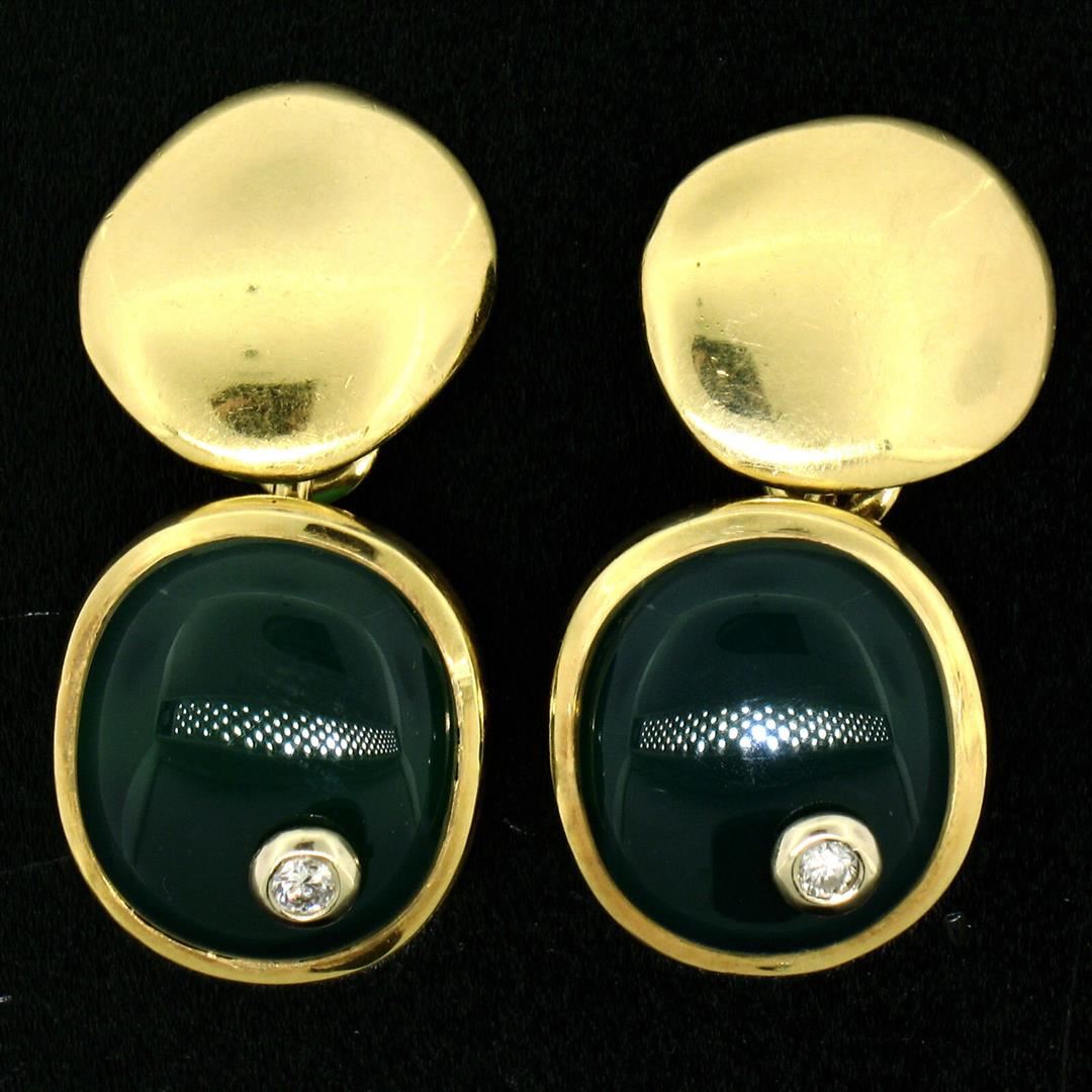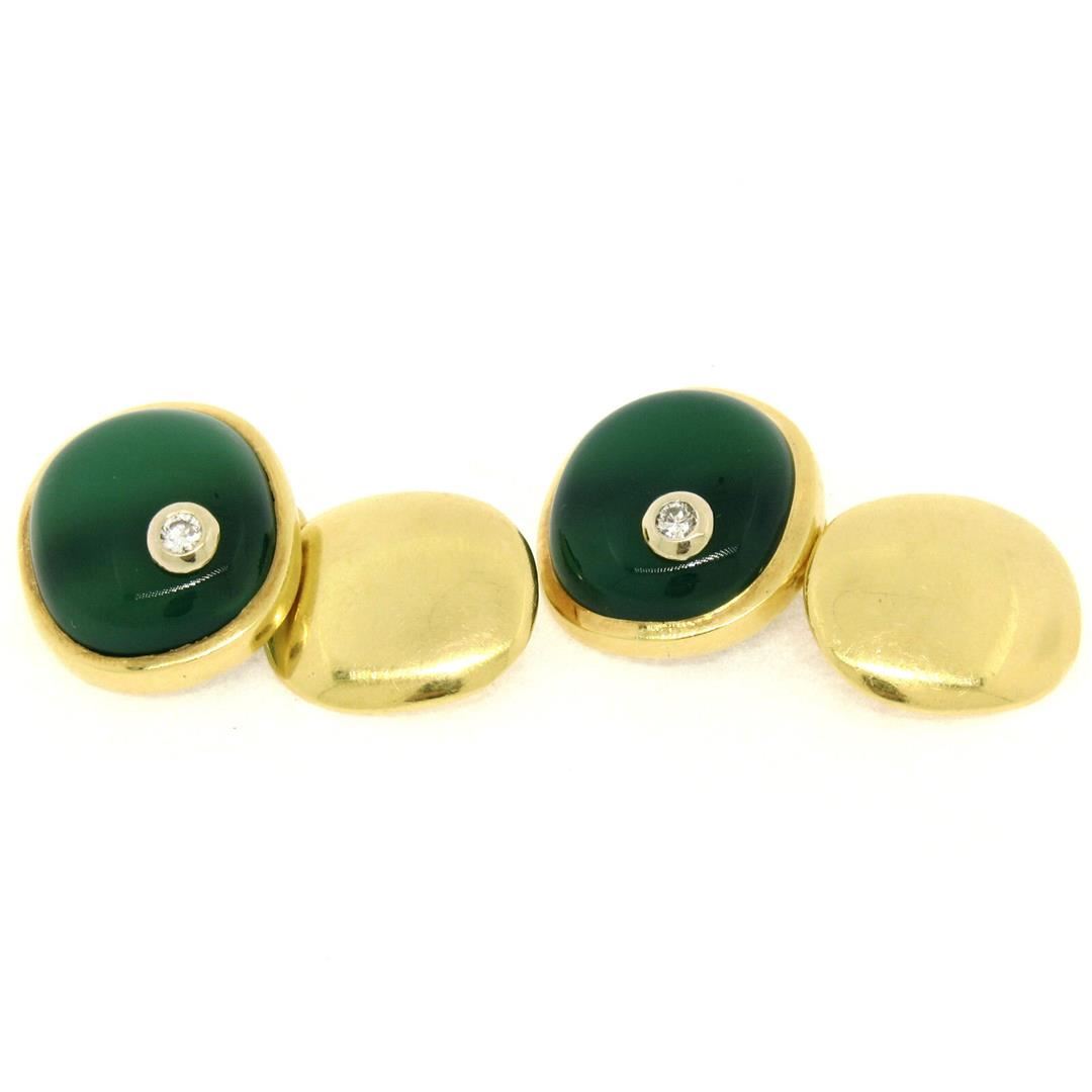 A solid 18k yellow gold cufflinks by Manfredi, with 2 cushion cabochon cut natural chrysoprase (13.5x11.9mm), and 2 round brilliant cut natural diamonds (VS1 ; E - 0.05ctw). These cuff links have a chain link design with a clearance of 17.40mm, weigh a total of 12.55 grams, and the front panels measure14.10x15.50mm.