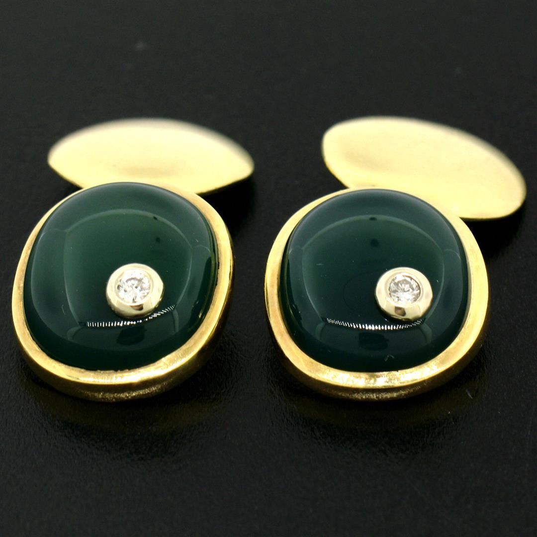 A solid 18k yellow gold cufflinks by Manfredi, with 2 cushion cabochon cut natural chrysoprase (13.5x11.9mm), and 2 round brilliant cut natural diamonds (VS1 ; E - 0.05ctw). These cuff links have a chain link design with a clearance of 17.40mm, weigh a total of 12.55 grams, and the front panels measure14.10x15.50mm.