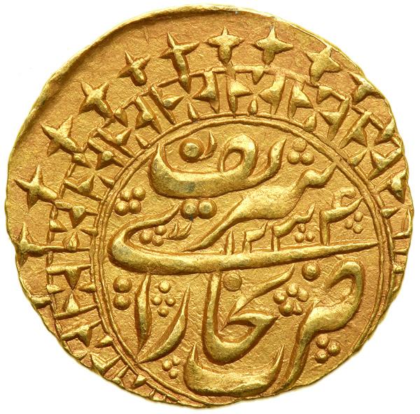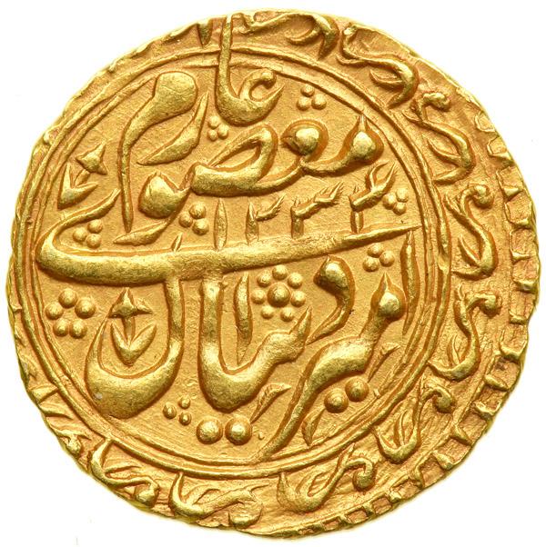 Manghit of Bukhara. Tilla, AH 1234. Album-3030.1; Torrey 9 v (date). 4.56 grams. Sayyid Haydar Tora, 1800-1826. Names of father and grandfather, with date. Mint and date. Extremely Fine.