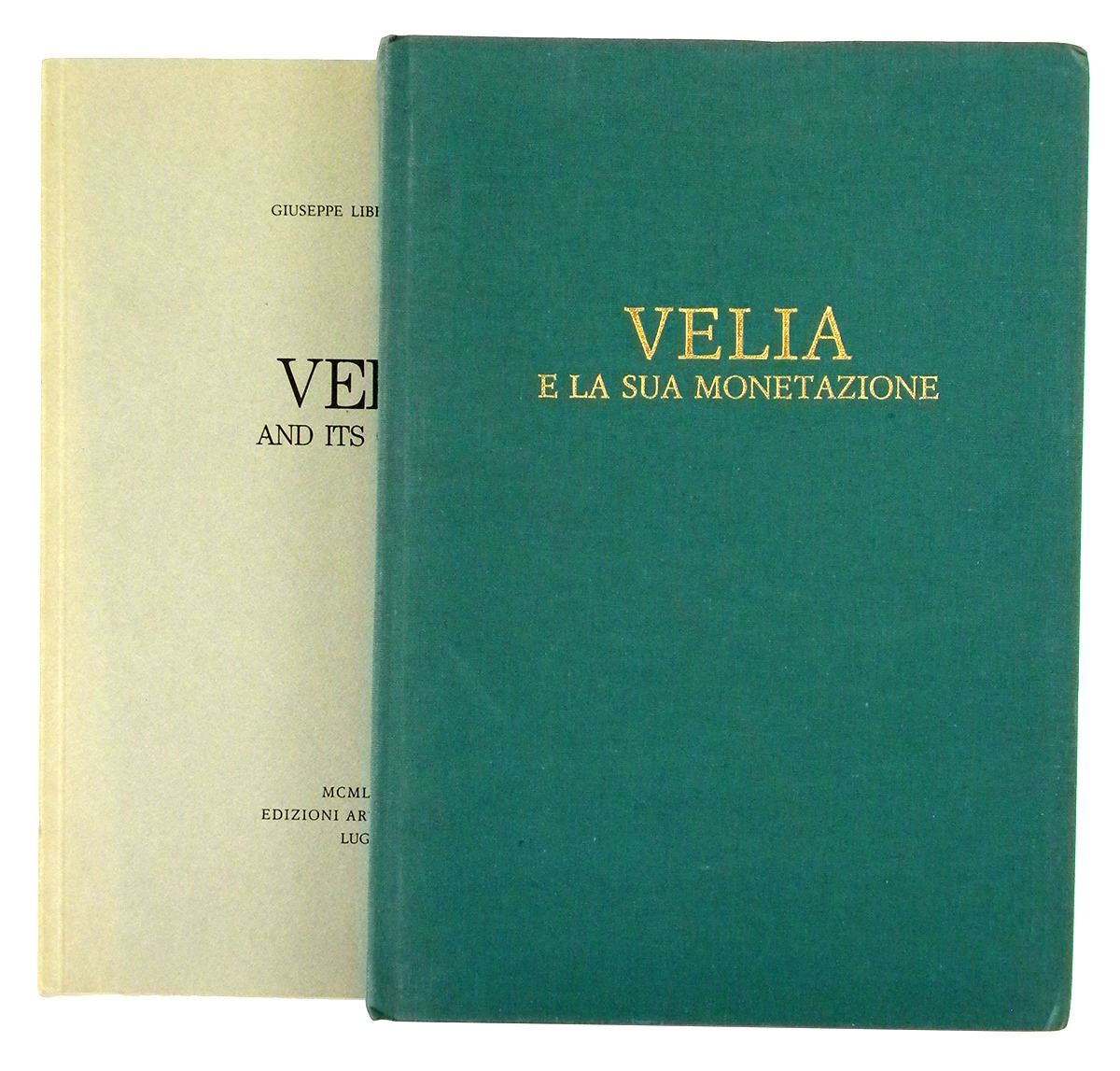 Mangieri, Giuseppe Libero. VELIA E LA SUA MONETAZIONE. Lugano, 1986. 4to, original green cloth, gilt. 140, (4) pages; map; 27 plates of coins, including enlargements. Near fine. [with] Mangieri, Giuseppe Libero. VELIA AND ITS COINAGE. Lugano, 1986. 4to, original printed card covers. (2), 38, (1), 39-69, 33, (3) pages. Near fine. The plated Italian version, with plates, along with the English translation. Daehn 2892 and 2893. From the library of Tom Cederlind.