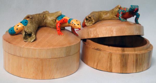 Mango Wood Keepsake Lidded Boxes Clay Lizards Tops. These matching keepsake boxes are lathe turned mango wood with hand formed polymer clay lizards on the tops. They were made in northern Thailand. Each is 4'' diameter x 3'' high.