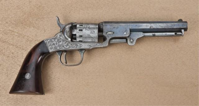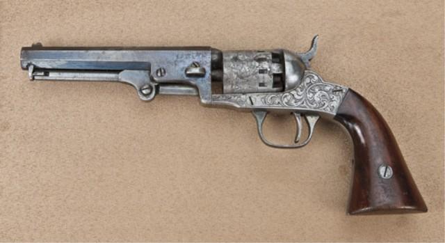 Manhattan .31 caliber percussion revolver, 5” barrel, blue and case hardened finish, varnish wood grips, standard engraved frame with rolled cylinder scene. Serial #3212 on wedge, no other serial numbers. Bottom of frame marked “Patented Dec 27, 1859”. The revolver shows a 12-notch cylinder and is rolled with a stagecoach hold-up scene. The barrel retains 50-70% evenly thinning and toning blue finish. Some minor erosion, mottling, and areas of pinprick pitting just starting. The front sight is an old hand-made brass replacement of the period. The cylinder shows 90% plus original cylinder scene and has been lightly cleaned to grey. The frame, hammer, and lever show strong traces of case hardening going to silvery grey patina. The trigger shows darkened silver plate. The varnish wood grips are very good show 50-70% varnish, slight mars, nicks, and wear at the edges, but are at least very good. The barrel address is sharp, the action tight, the interior good and bore bright. A well cared for early Civil War era Manhattan. Refer Flayderman 5C-008. Est: $700 - $1,400