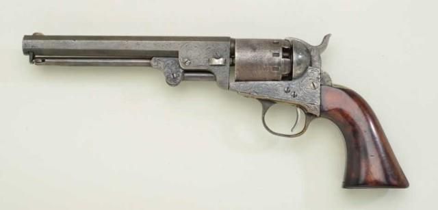 Manhattan 36 cal Navy revolver with 6-1/2? barrel New York scroll engraved in Nimschke style with a brown patina finish, burl wood grips in partition style case. Serial #17472. The pistol shows well defined engraving and some scattered light to moderate pitting with a few areas of slightly heavier pitting on the cylinder. The barrel address is good, the cylinder shows about 50% scene, the action is not working. The burl wood grips are in good condition and show a small repair to the toe, with a light re-varnish but no sanding and excellent fit. The engraving is better than average and nicely executed. The ram rod latch and a couple of screws are old replacements as is the wedge. The revolver is contained within an old period case, shows a partition style lining, the lining is in very good condition with some normal fading, fraying, aging and impressions at contact areas. The case is period and probably agent or dealer supplied. A peacock flask Manhattan marked mold, nipple wrench, cap box and key are included. The exterior of the case shows some scratches and aging but is at least good to very good.