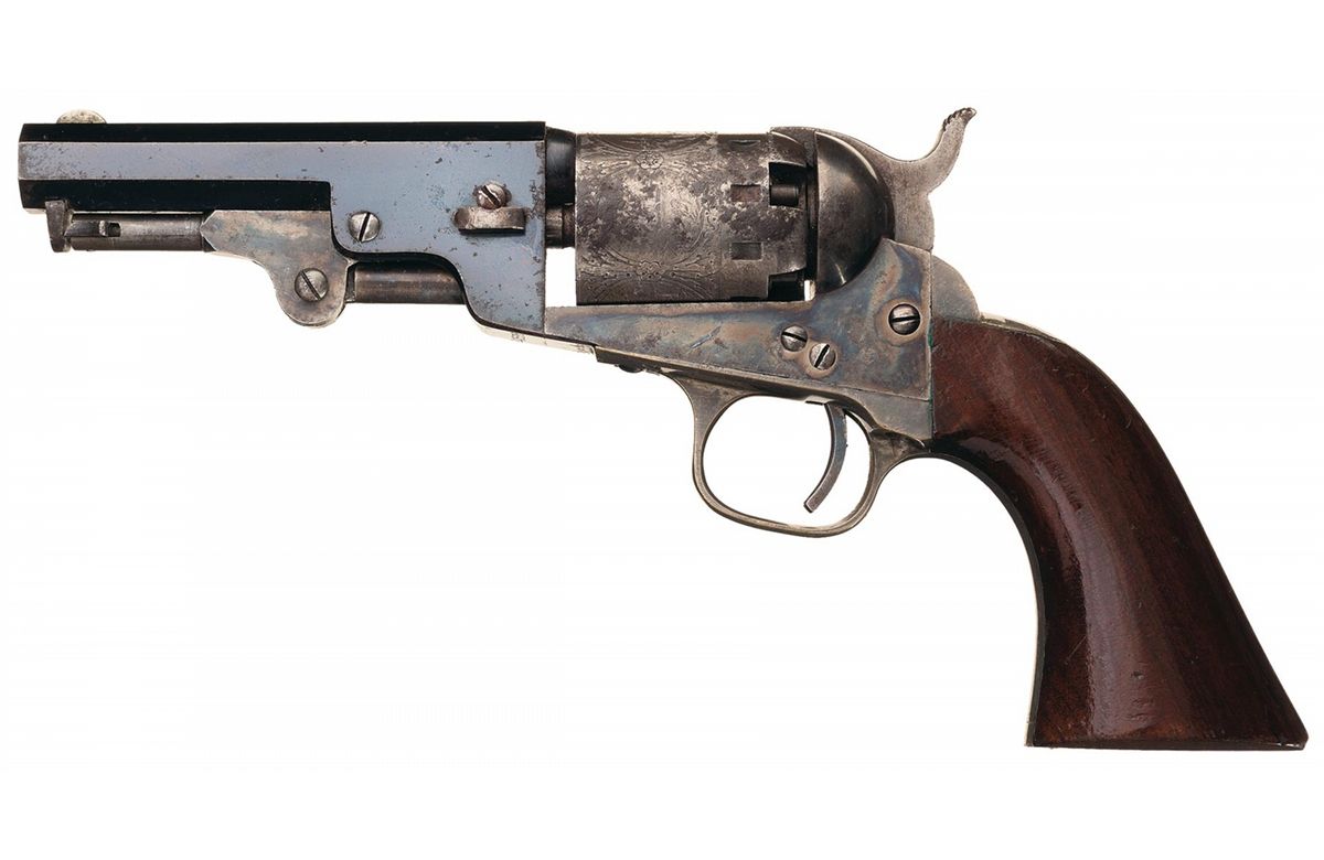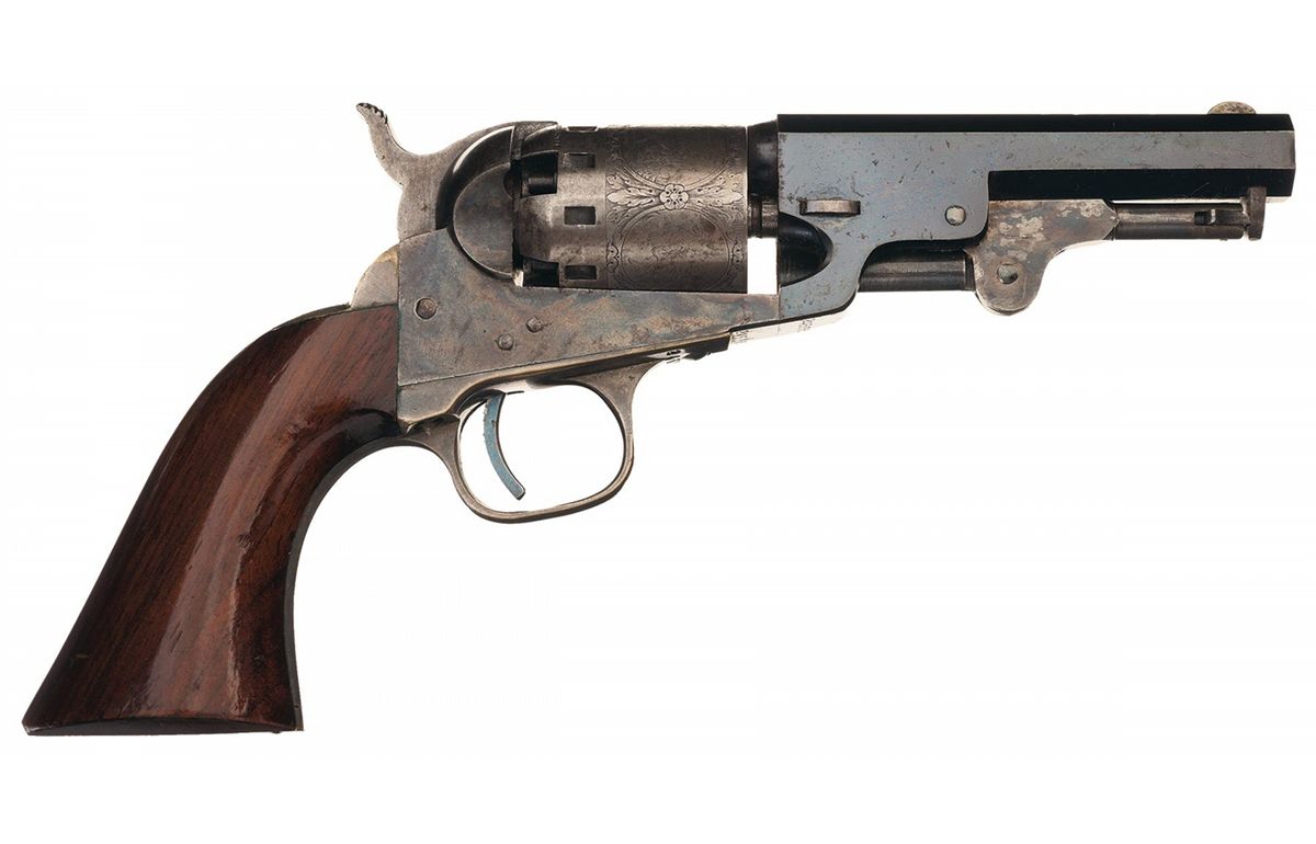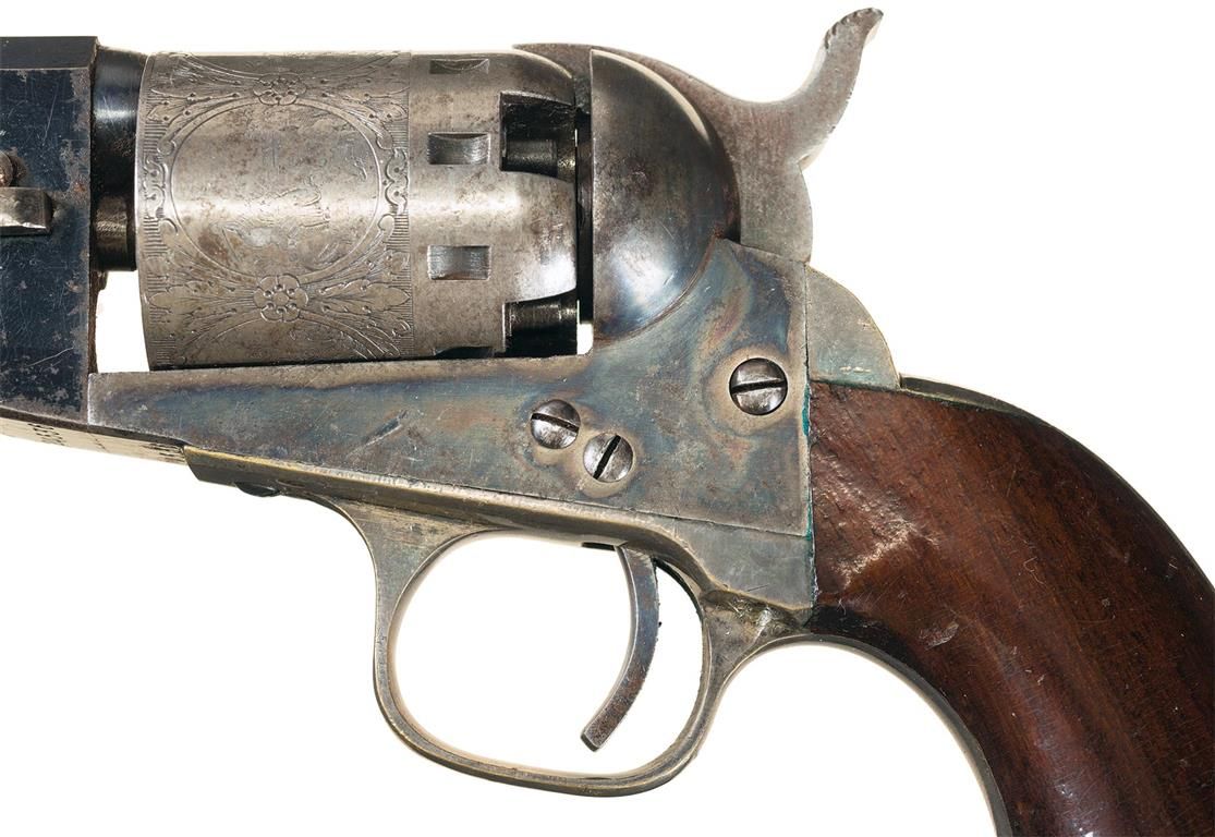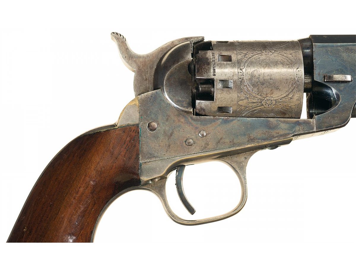 Manufactured 1859-1868. This Series III Type revolver has the one line address marked on the top barrel flat and the engraved military and navy scenes in oval panels on the cylinder. The matching serial number is marked on the bottom of the barrel, frame, trigger guard, back strap, wedge and cylinder pin, and the partial serial number "536" is marked on the rear of the cylinder. The wedge is un-numbered. Blade front and hammer notch rear sights, blue barrel and cylinder, silver plated trigger guard and back strap, and casehardened remaining parts. Fitted with smooth varnished one-piece walnut grip.