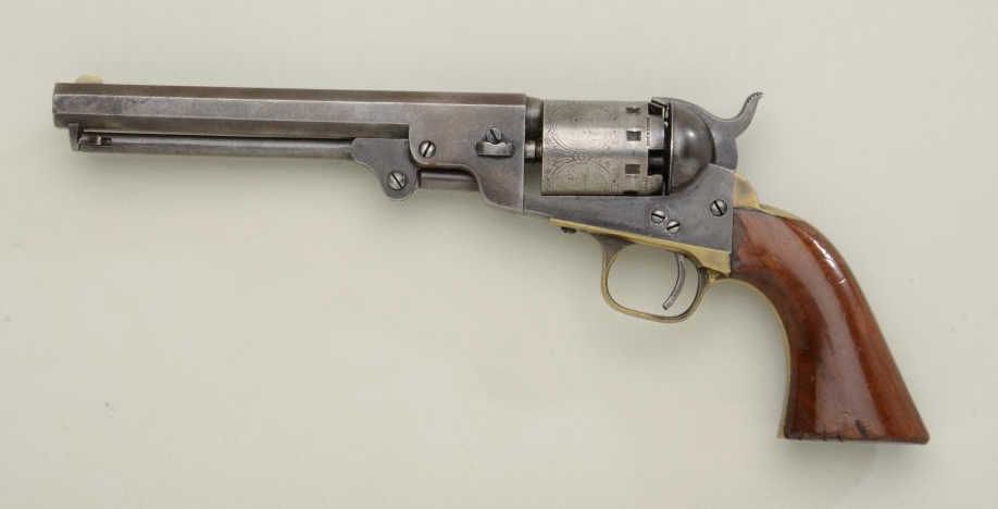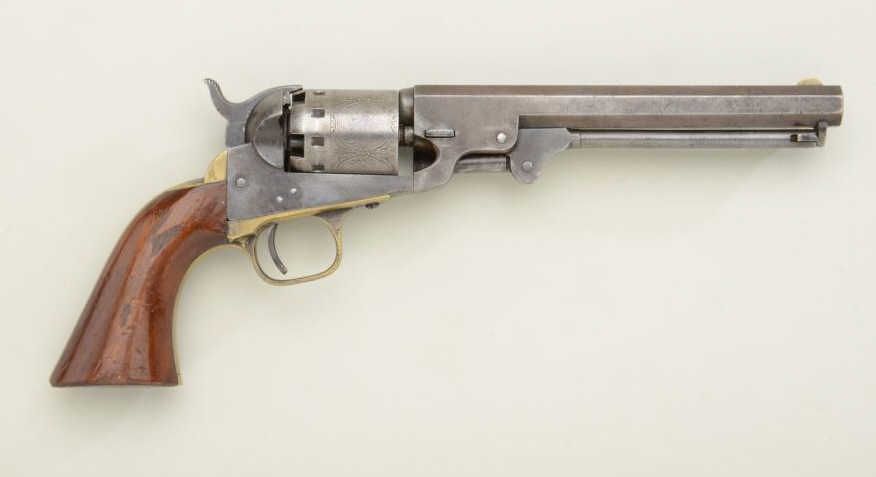 Manhattan Firearms Co., .36 cal. revolver with 6-1/2" barrel, blue and case hardened finish, varnished wood grips in very good original condition, serial #21262. The barrel shows 10-20% blue drifting to a lightbrown patina, with scattered light to moderate erosion, good markings, good edges. The cylinder shows 80-90% scene and a gray patina; the hammer and frame show strong traces of case hardening with natural aging. The straps show traces of darkened silver and a nice brass patina. The varnished wood grips show 75-85% varnish, wear at the edges, some tacking marks on bottom of grip, and 5 notches cut into bottom of left grip. Allmatching visible serial numbers; good tight action, bright bore, good to very good overall. A nice Manhattan. Est.: $600-$1,200