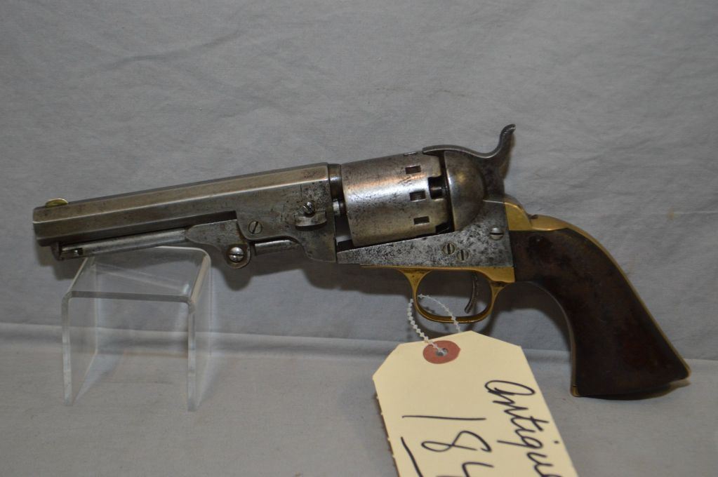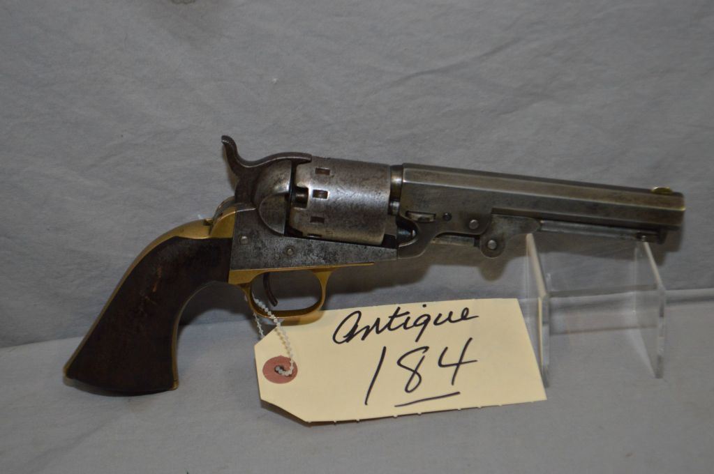 Manhattan Firearms Co. Model Navy Series 1 .36 Perc Cal 5 Shot Revolver w/ 5" octagon bbl [ appears to be all matching numbers, fading blue finish, faint cylinder scene, barrel markings "Manhattan Firearms Co. Newark N.J.", brass trigger guard & grip straps,one piece walnut grips, Circa 1859 - 1868 ] Ser # 2821