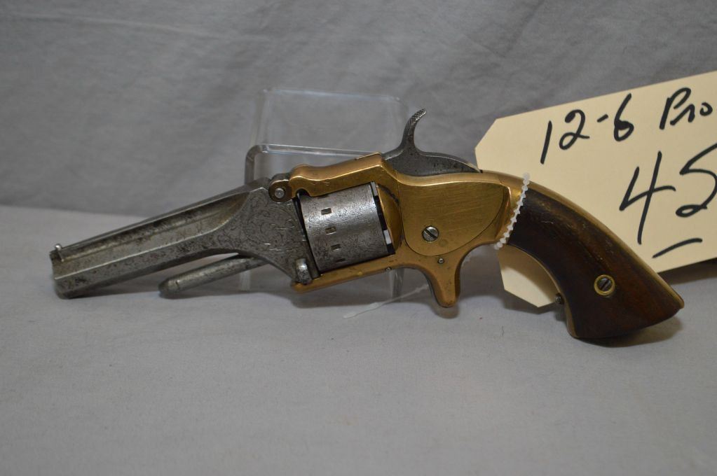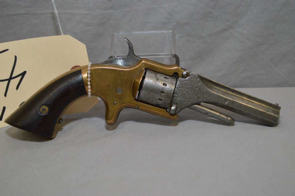 Manhattan Firearms Manufacturing Company Model First Model Pocket 2nd Variation .22 Rimfire Cal 7 Shot Revolver w/ 76 mm bbl [ octagon ribbed barrel, with some faint scroll engraving turned grey, Manhattan Firearms Co. New York Address, solid cylinder, brass frame with spur trigger, good walnut ? grips ] Ser # 2188 12 - 6 Prohib EXPECT DELAYS IN TRANSFER Cert # 8749520