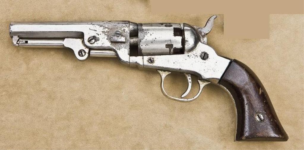 Manhattan First Model five-shot Pocket percussion revolver, .31 cal., 4” barrel, nickel finish, wood grips, #3804. This gun is in overall fair + to good condition showing approx. 80% nickel finish with a good action and bore that should clean to good; grips are fair + to good overall with a scattered nicks and mars from carry and storage and a crack on the right grip behind the screw escutcheon. Est.: $400-$800.