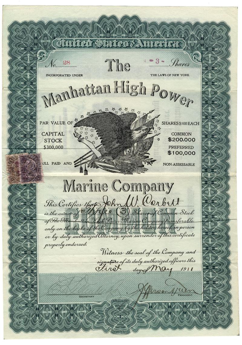 1911, New York. Bond for 3 shares. Green. Top center vignette of an eagle perched on a crest. Revenue stamp at left border. Uncancelled and fine.